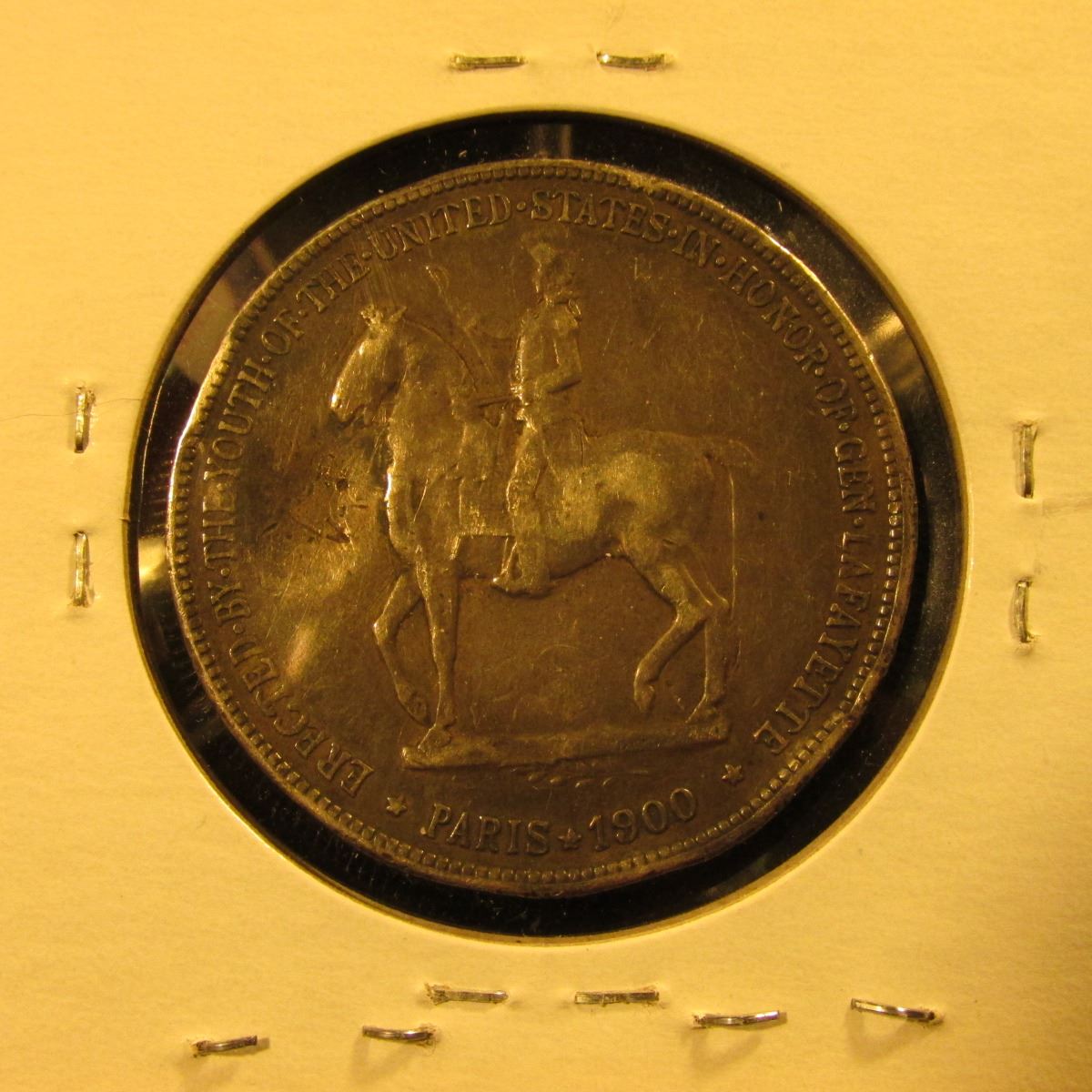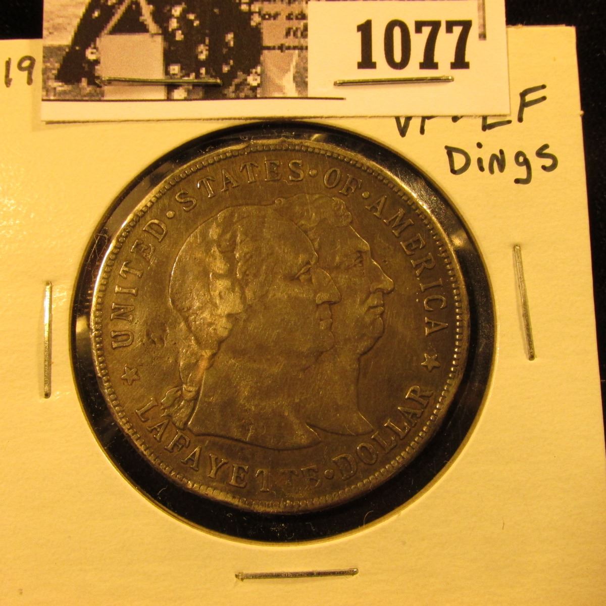 1077 . 1900 Lafayette Silver Commemorative Dollar, VF-EF but with rim dings, bends, dents, and etc.