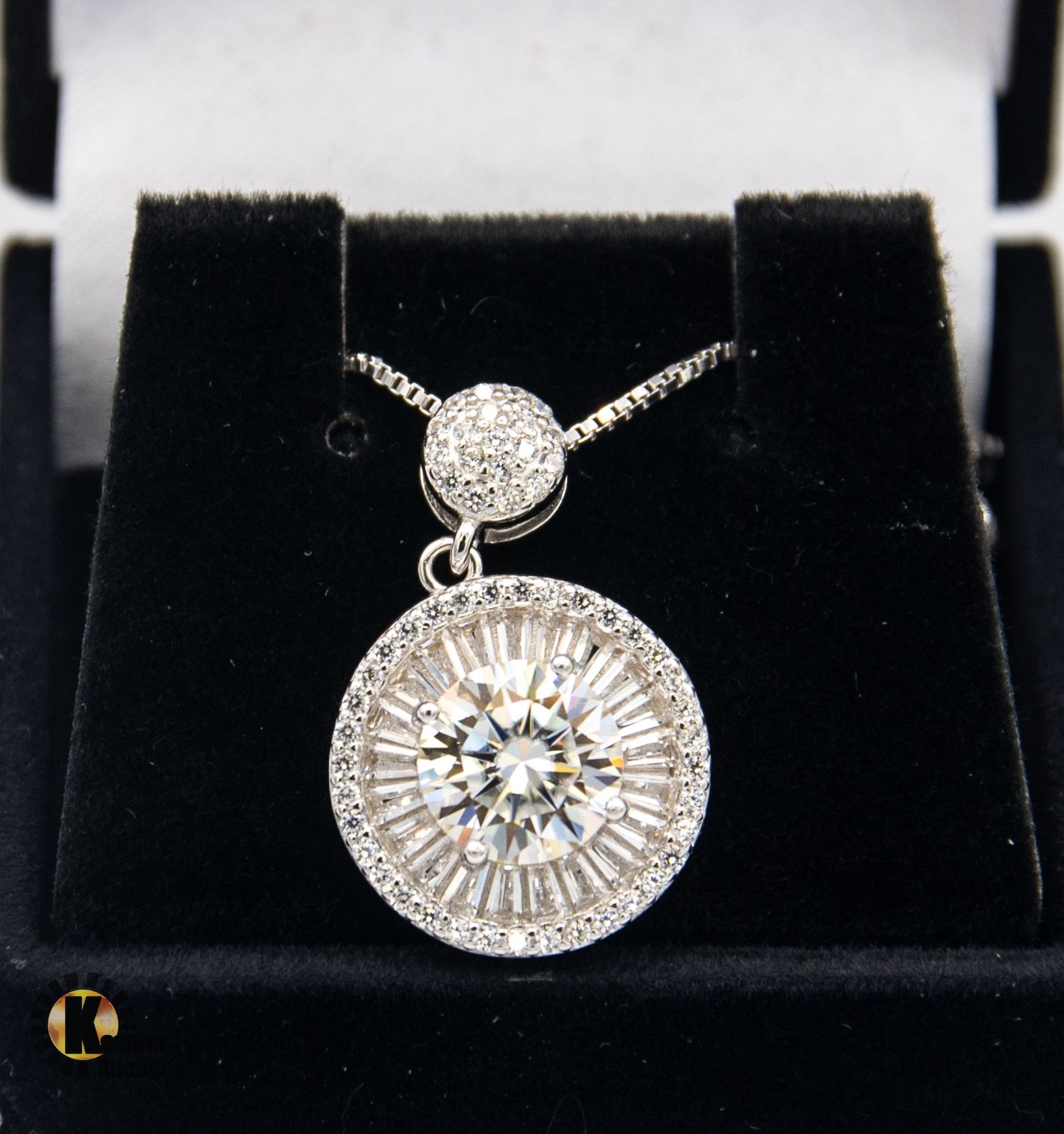 VVS D COLOR SET IN CENTER OF STARBURST OF TAPERED BAGUETTE CUBIC ZIRCONIA SURROUNDED WITH ROUND HALO OF ROUND CUBIC ZIRCONIA SET IN 925 SILVER PENDANT