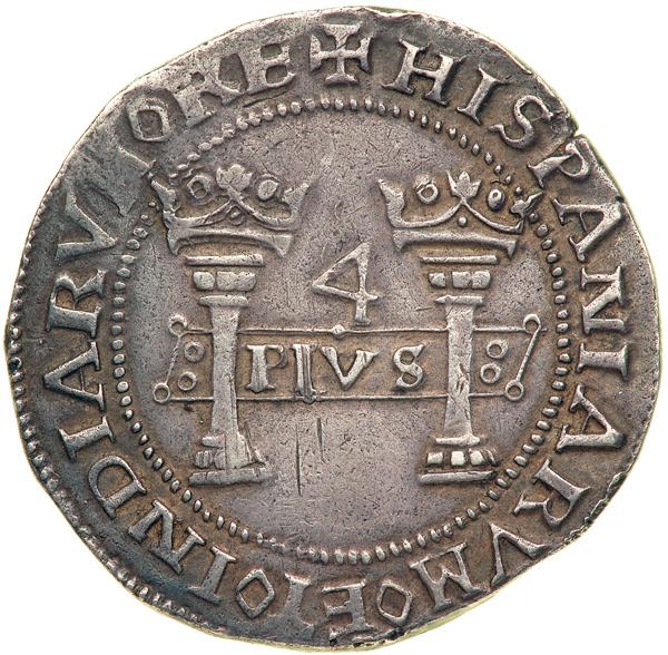 Mexico. 4 Reales, No Date-oMo-oPo (Mexico City, Assayer "P"). KM-0017; Cayon-3117. 13.59 grams. Carlos & Joanna, 1516-1556. Early Coinage (1538-1541); small central design. Crowned arms of Castille and Leon. Reverse: Crowned pillars, value between, rhomboidal panel with rightward slant with circles (without assayer mark). Choice sharp strike on lightly oval flan. Handsome old collection toning. Very Rare.