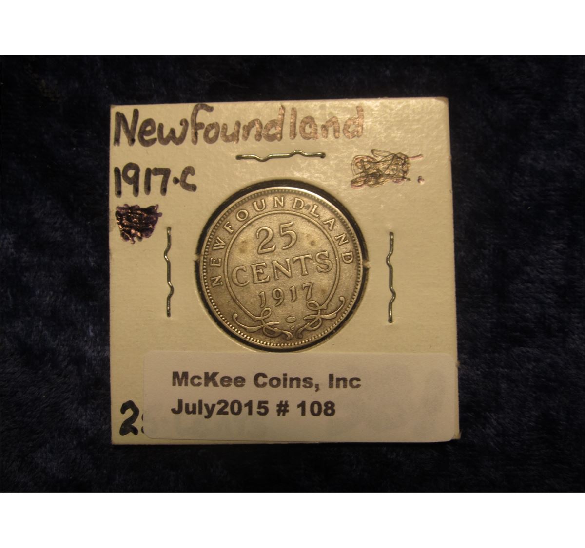 108. 1917 C Newfoundland, Canada Silver Quarter. F-12.