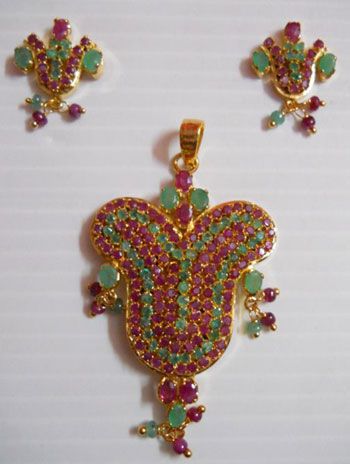 108.65 CTW GOLD PLATED EMERALD AND RUBY PENDANT AND EAR **|**|** 108.65 CTW GOLD PLATED EMERALD AND RUBY PENDANT AND EARRING SET STERLING SILVER ; MSRP: $1100