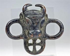 Ca. 800 – 1000 A.D. Solid bronze animal with cross applique. S. 8,5 x 7,5 cm P.