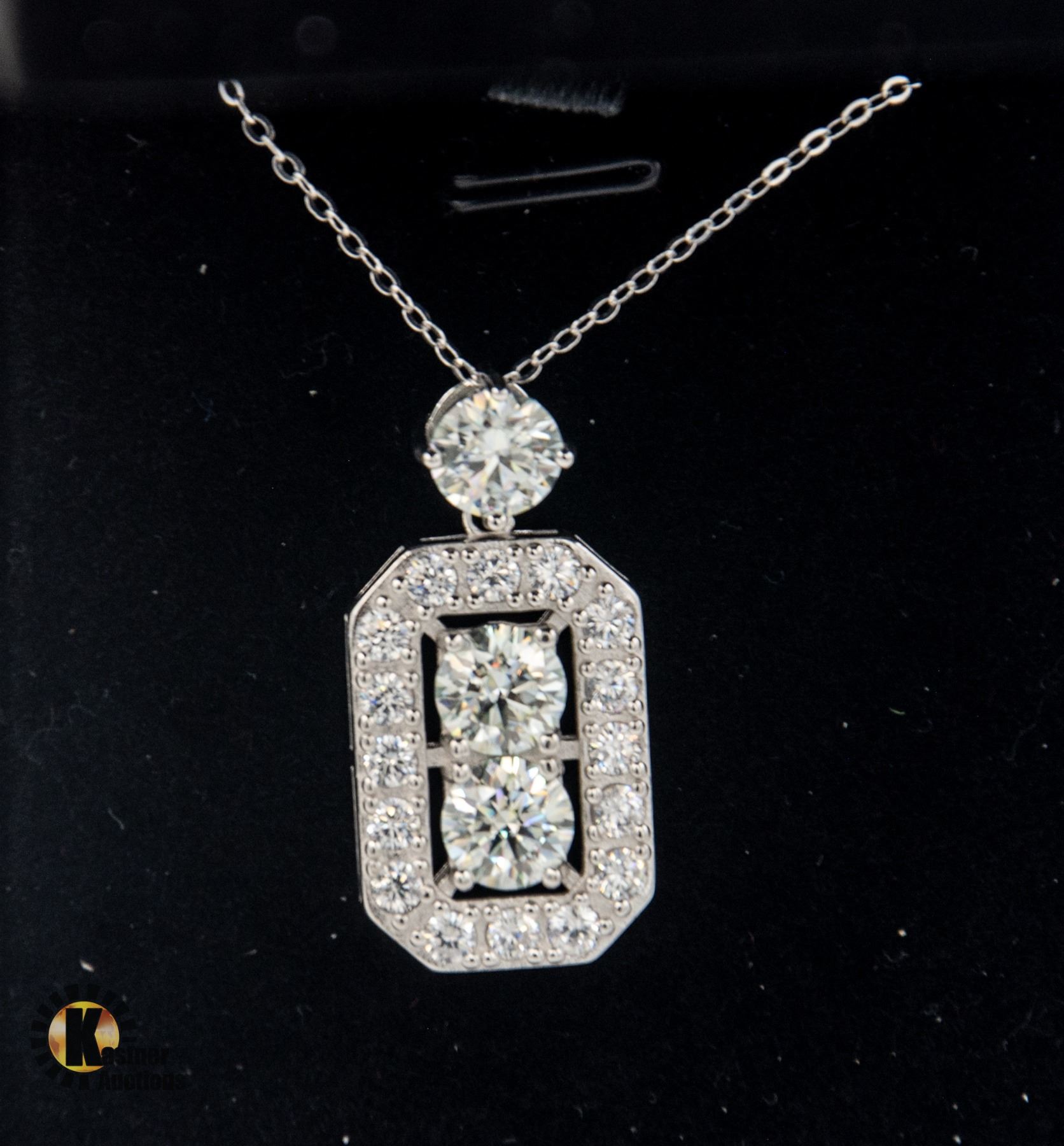 MOISSANITE STONES VVS D COLOR SURROUNDED BY RECTANGULAR SHAPED HALO SET IN 925 SILVER PENDANT **ALL ITEMS MUST BE REMOVED BY 5PM SATURDAY, DECEMBER 7TH 2024. ALL REMAINING ITEMS WILL BE SUBJECT TO A $6.00 PER DAY STORAGE CHARGE. ANY ITEMS REMAINING AFTER MONDAY, DECEMBER 23RD 2024 WILL BE CONSIDERED FORFEITED. NO REFUNDS WILL BE ISSUED FOR FORFEITED ITEMS. TO SCHEDULE A PICK UP APPOINTMENT CLICK HERE