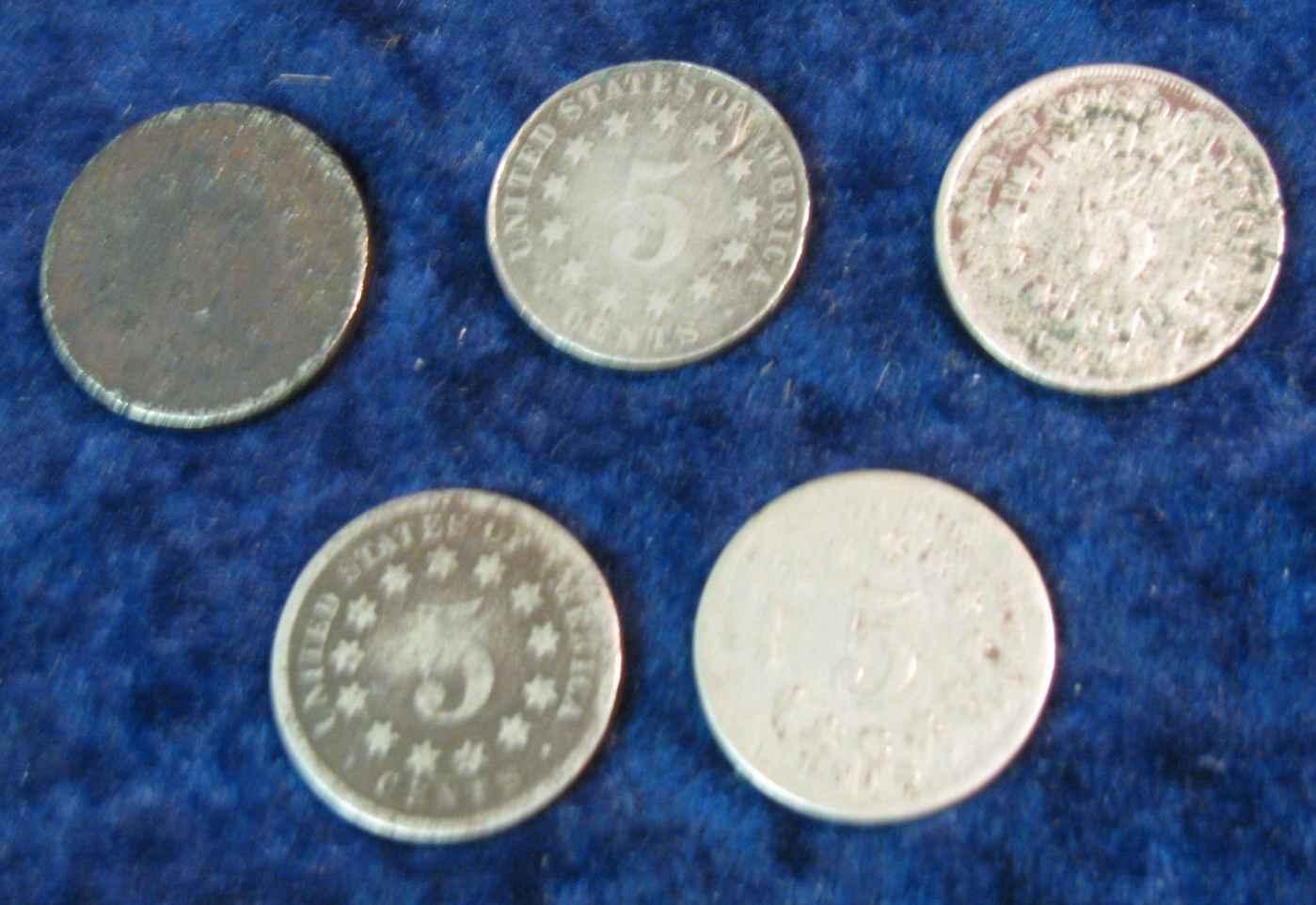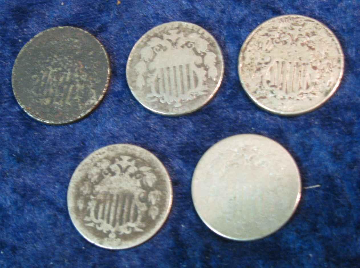 1082. 1867, (2) 68, 82 & 83 Shield Nickels. AG.