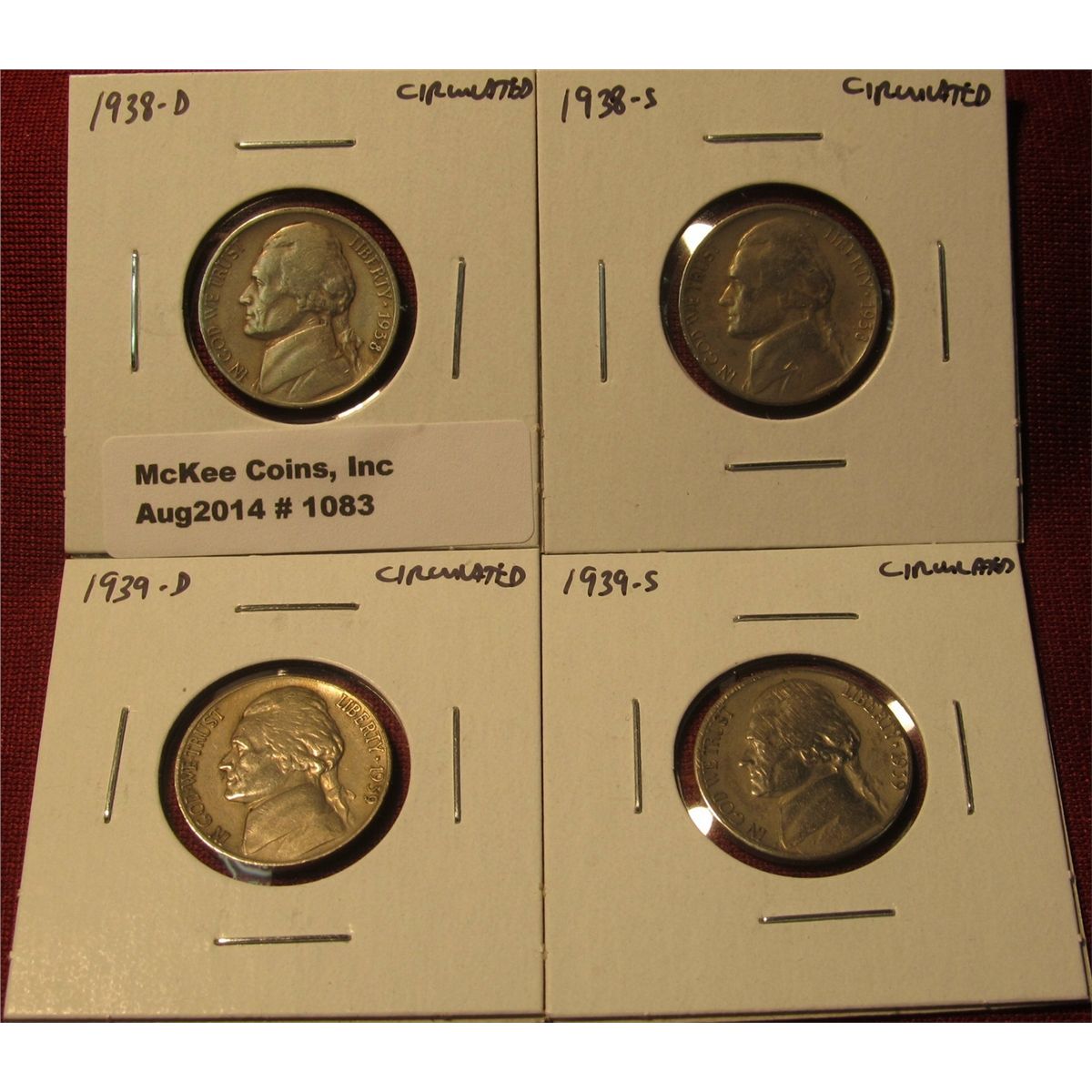 1083. 4 circulated Jefferson Nickels – 1938-D, 1938-S, 1939-D & 1939-S