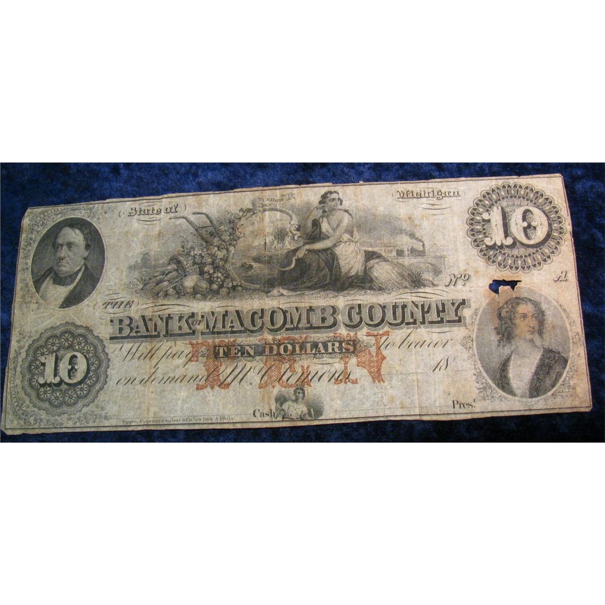 1084. 1850's Broken Bank Note $10. Bank of Macomb County Michigan. VG. Holes in Paper.