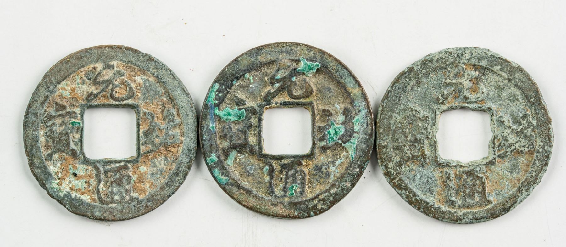 Three (3) assorted 1086-1093 Chinese Northern Song dynasty 1 Cash bronze coins, obverse lettering Yuan You Tong Bao in cursive script, D: 24-24.3 mm, 9.84 grams