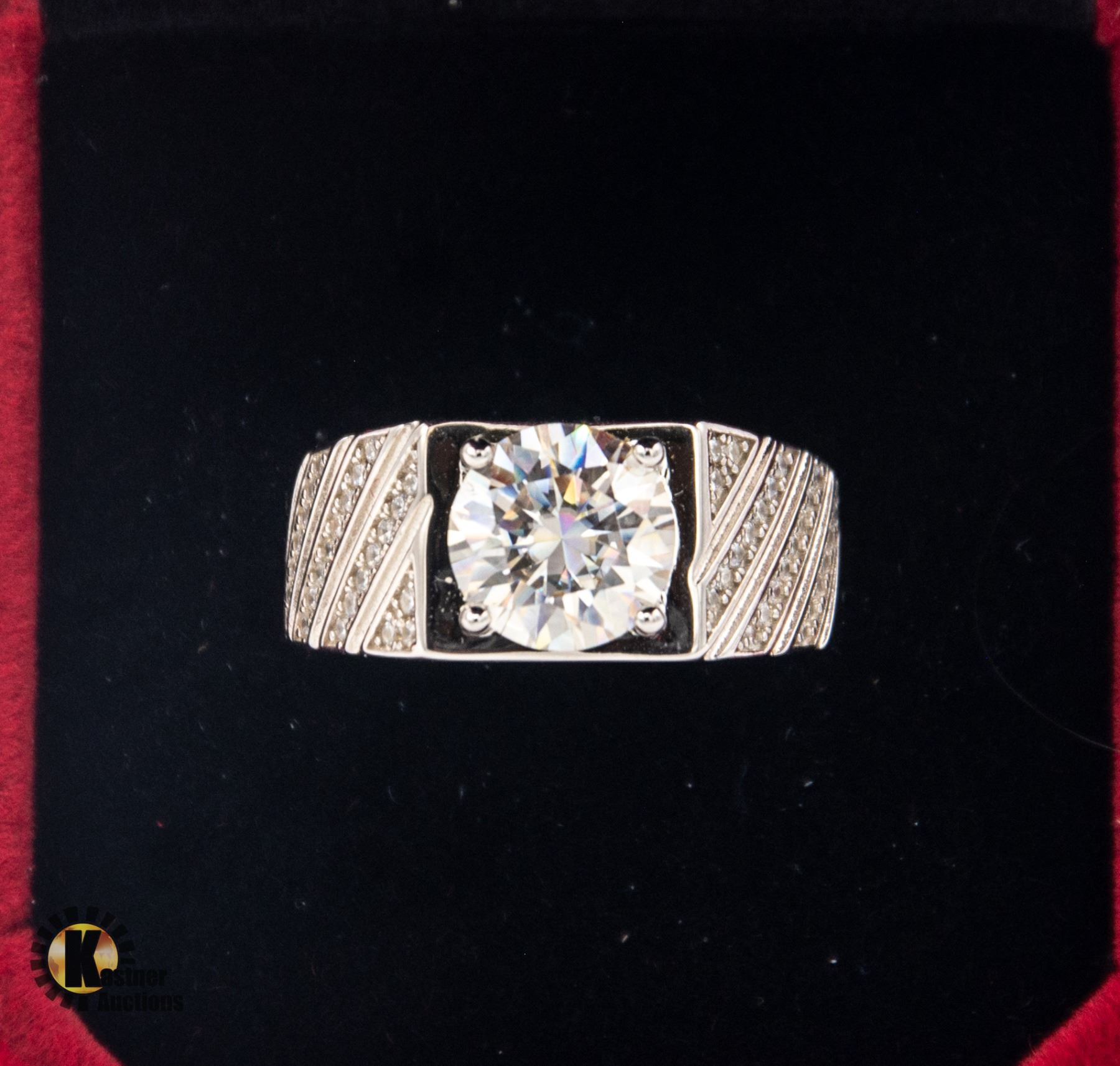 MOISSANITE STONE VVS D COLOR SET IN CENTER OF RING WITH 50 ROUND CUT CUBIC ZIRCONIA SET ON SIDES OF RING SIZE 10