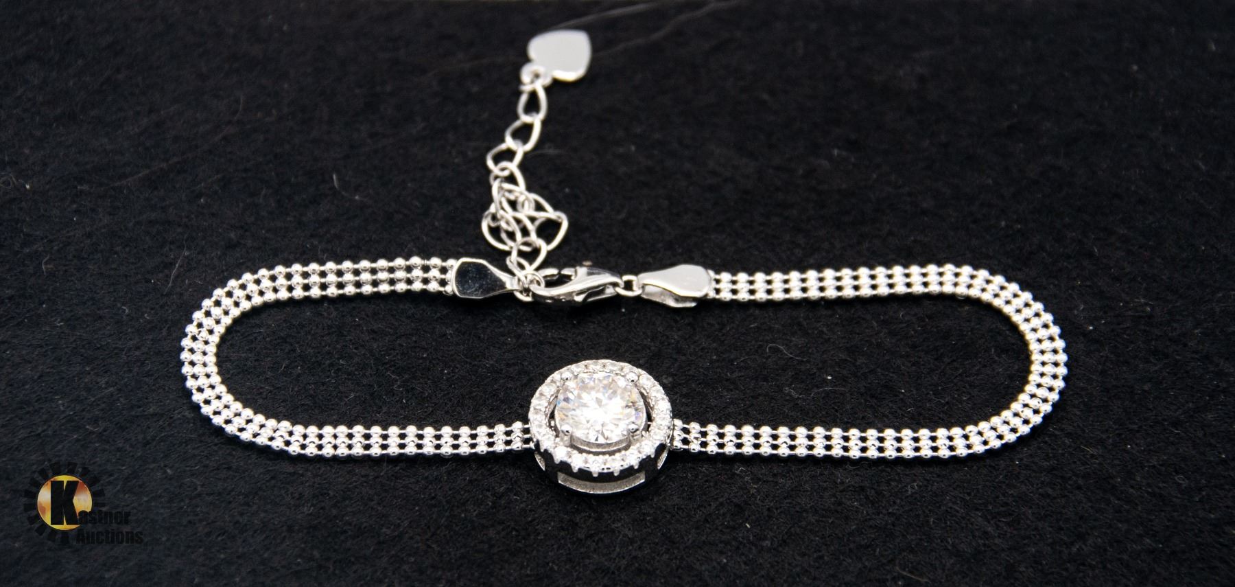 MOISSANITE STONE VVS D COLOR SET IN CENTER OF ROUND HALO WITH 21 ROUND CUT CUBIC ZIRCONIA SET IN 925 SILVER BRACELET