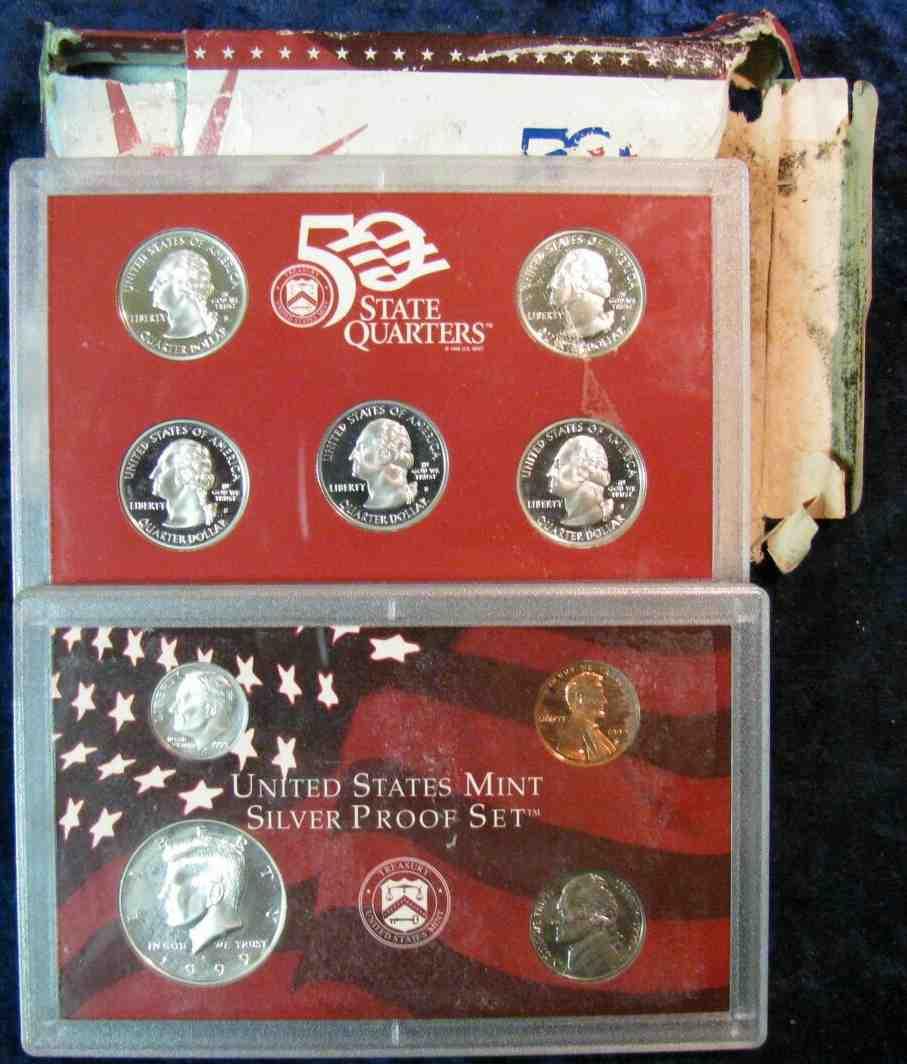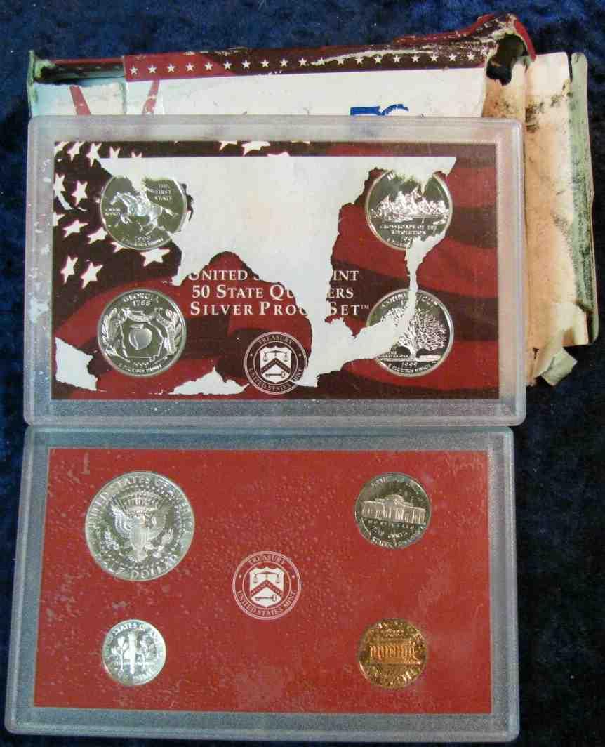 1089. 1089. 1999S US Silver Proof Set. Box Ruined by Water, Cent Has Some Corrosion all Others Coins Look Nice.