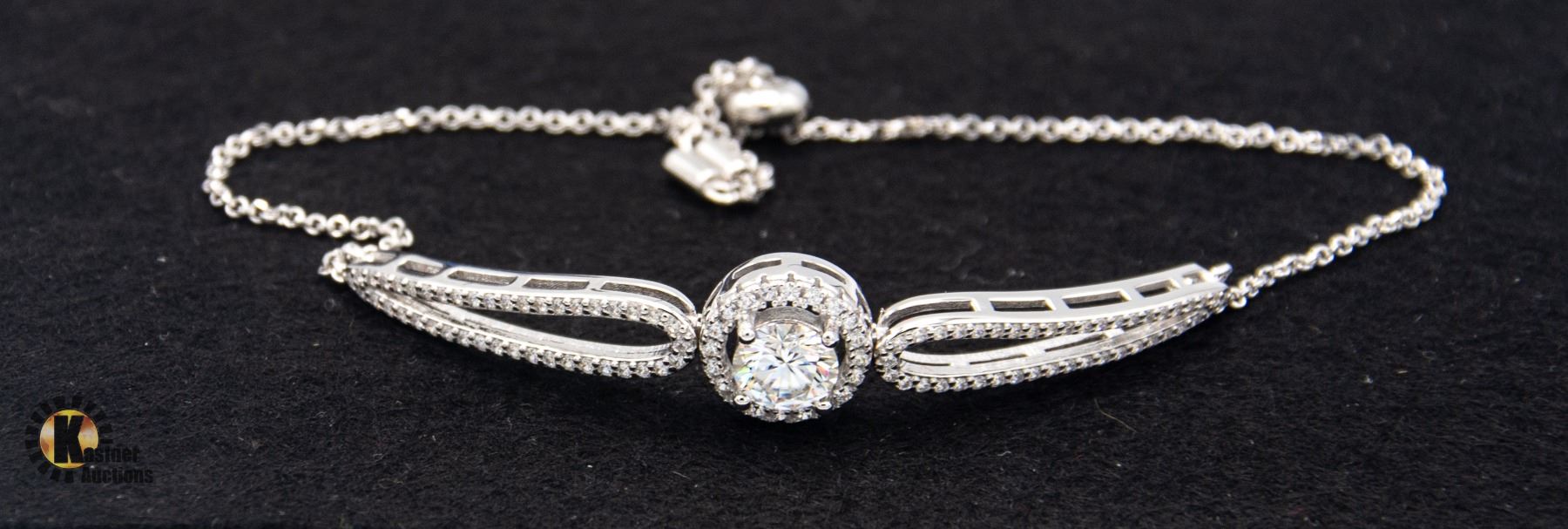 MOISSANITE STONE VVS D COLOR SET IN CENTER OF ROUND HALO WITH 20 ROUND CUT CUBIC ZIRCONIA WITH 42 CZS ON EITHER SIDE OF BRACELET SET IN 925 SILVER BRACELET