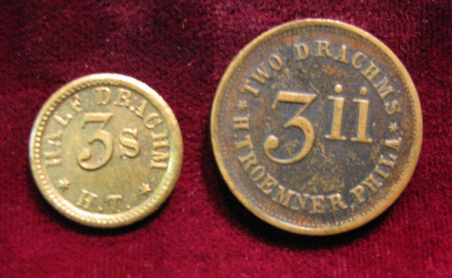 1091. 1/2-Drachm & 2-Drachms Apothacary Weights, H. Troemner, Philadelphia.