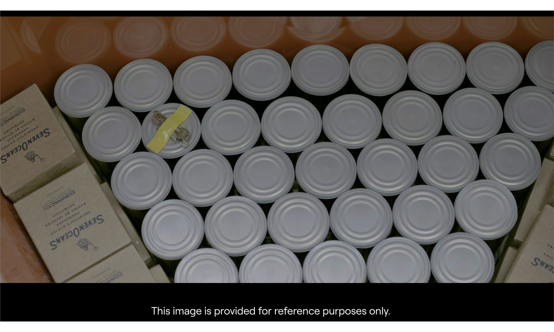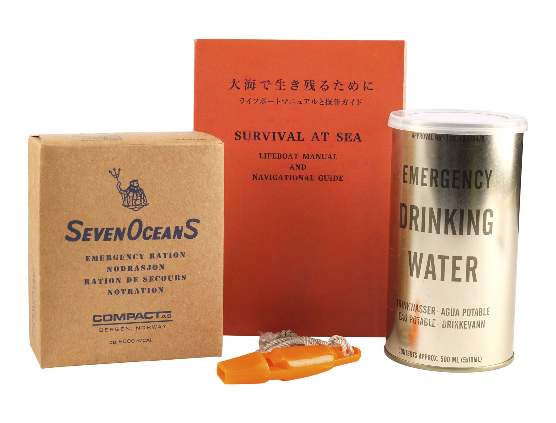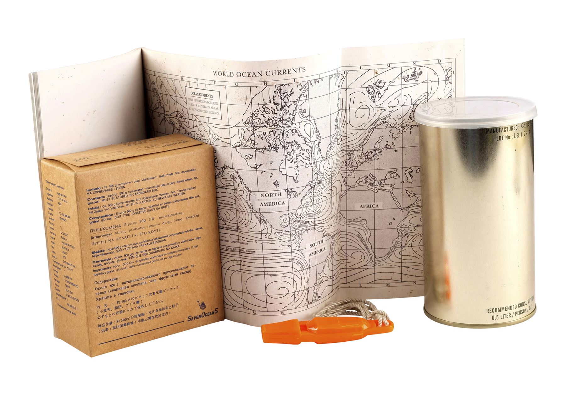 This lot consists of a cardboard box of Seven Oceans with a pouch of rations inside; an orange plastic and white nylon whistle; a metal can with plastic lid; and an orange Survival At Sea survival manual with a Post-it note marked "REG PAPER INT WATERPROOF WP COVER GOOD FOR SOUVENIRS." This lot exhibits minor scuffing to the can and grime on the manual. Dimensions: (largest) 5.25" x 7.25" x 0.25" (13.5 cm x 18.5 cm x 0.75 cm)
