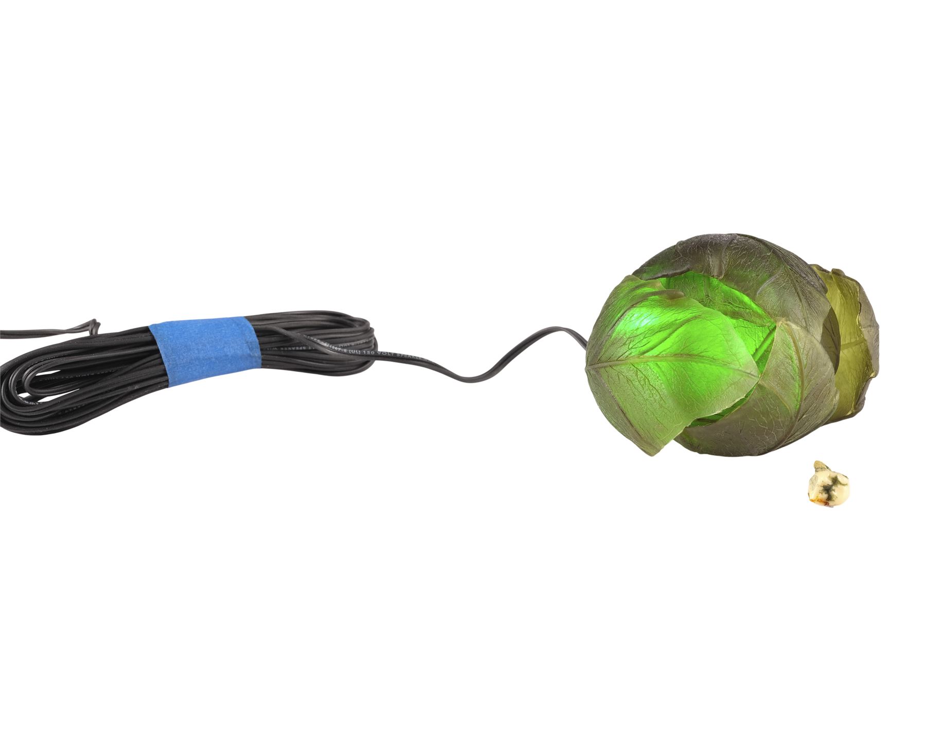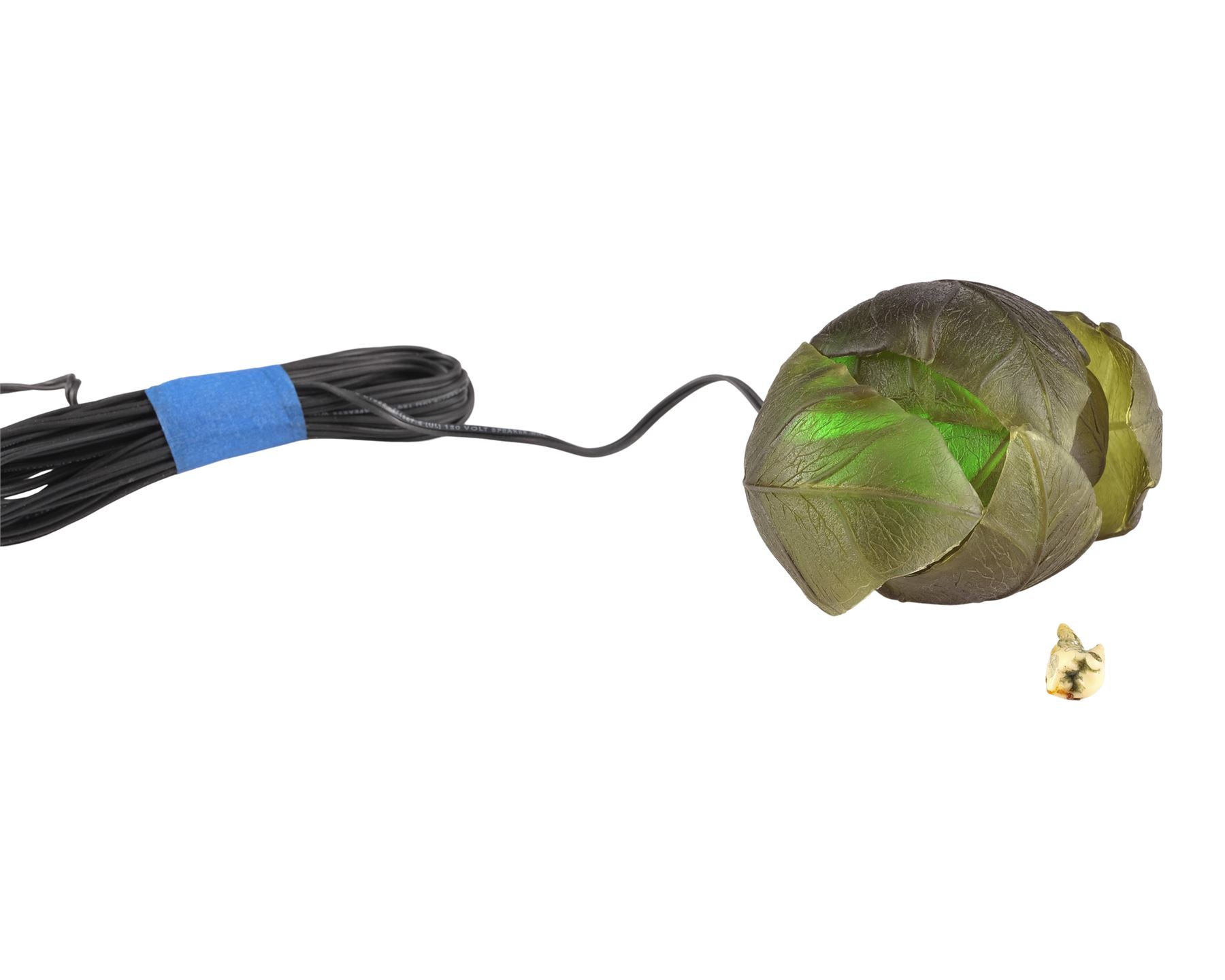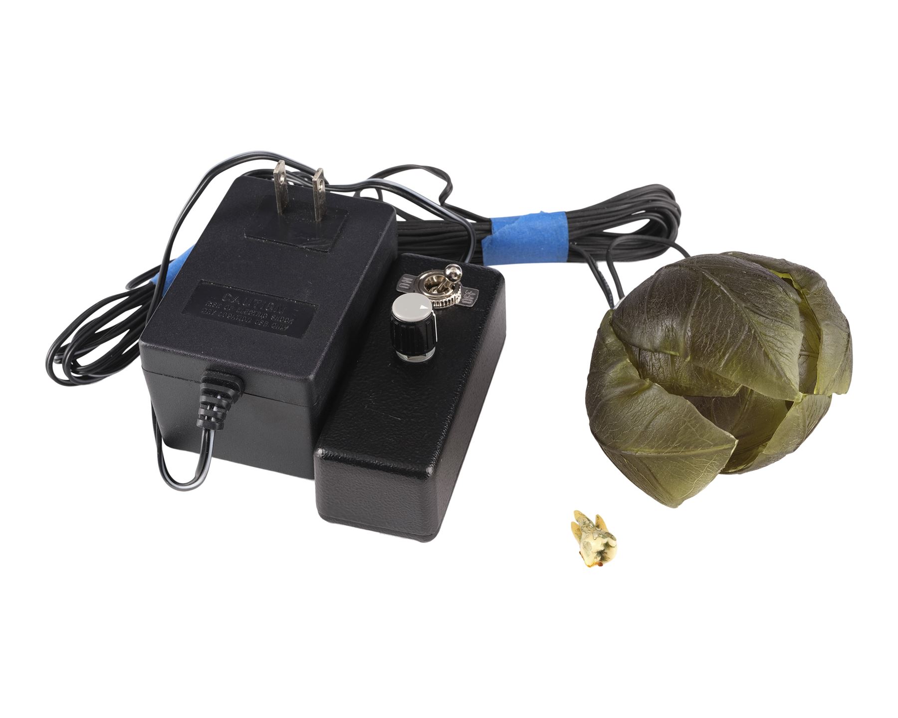 This lot consists of a resin molar tooth colored to appear rotted; and a green translucent silicone plant with a clear acrylic base and a metal light-up bulb and connection adapter. This lot lights up when the bulb is placed within the acrylic base and the switch on the adapter and controlled by a dimmer. This lot exhibits minor grime on the plant. Dimensions: (largest) 6" x 7" x 2" (15.25 cm x 18 cm x 5 cm)