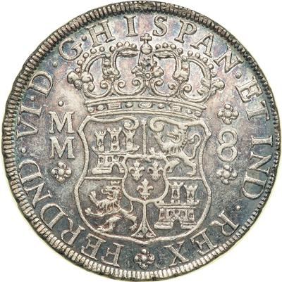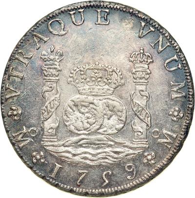 Mexico. 8 Reales, 1759-Mo-M.M. Eliz-47; WR-9; KM-104.2. Ferdinand VI. Pillar issue. Reflective fields with lovely peripheral toning. NGC graded MS-62.