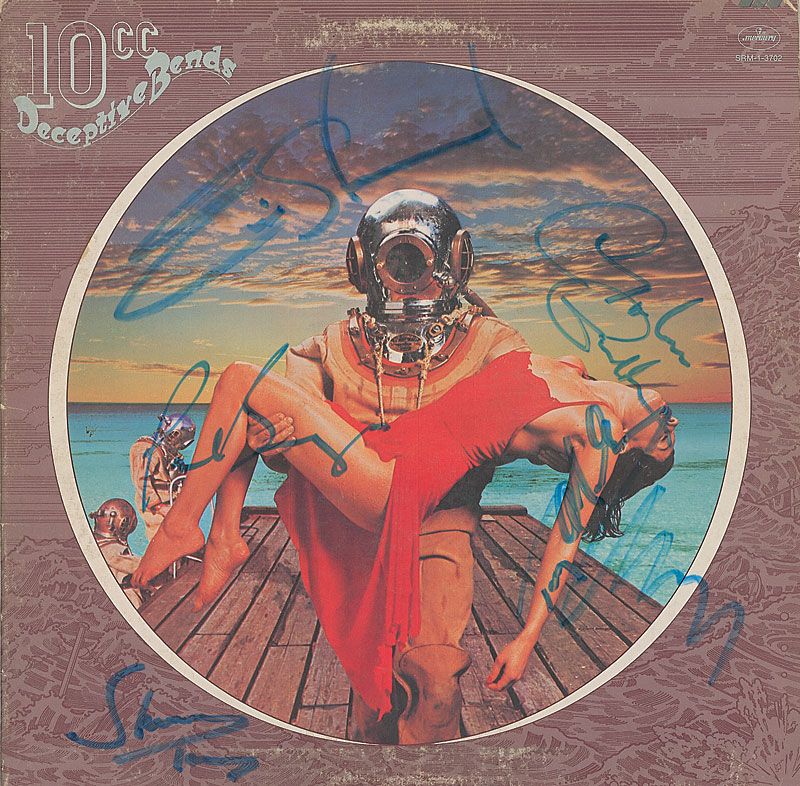 Deceptive Bends album signed on the front cover in blue felt tip by Graham Gouldman, Eric Stewart, Stuart Tosh, and two others. In very good condition, with a couple signatures a few shades light, but still legible, some corner creases, and mild ‘ring of wear’ to both covers. The record is included.