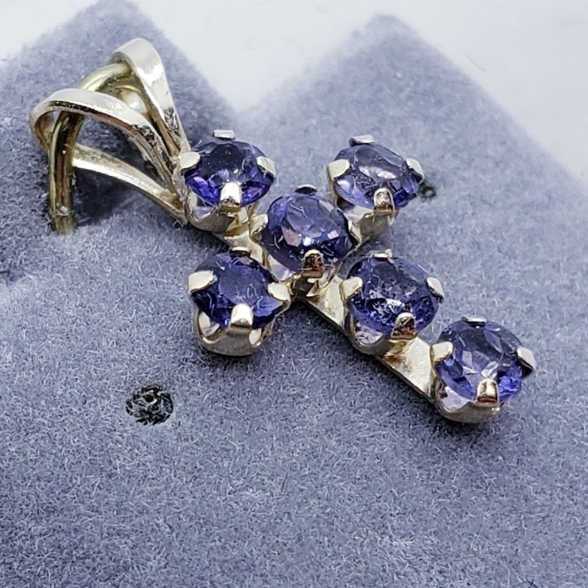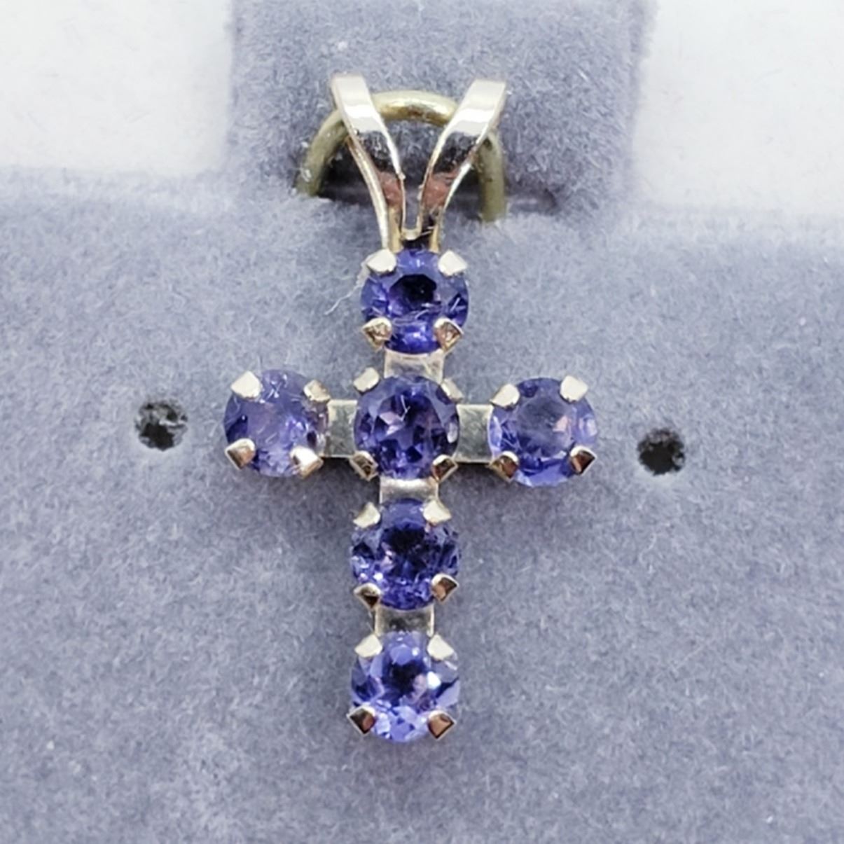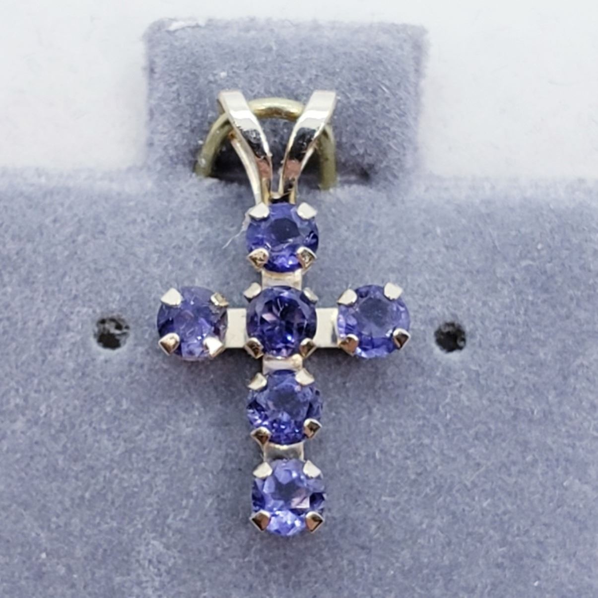 10K YELLOW GOLD 6 SAPPHIRE CROSS (0.35ct) PENDANT, MADE IN CANADA. SUGGESTED RETAIL VALUE $240 ESTIMATE $200 - $240.