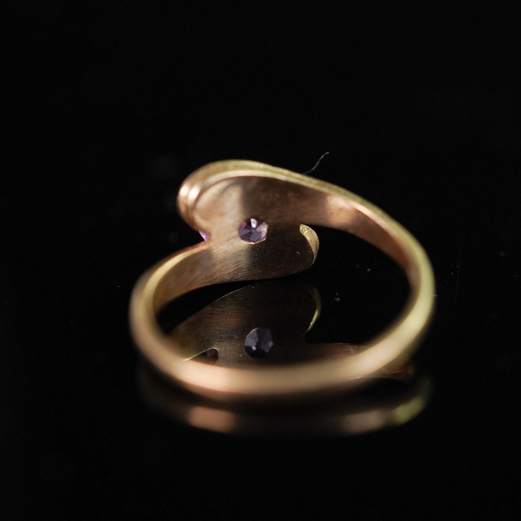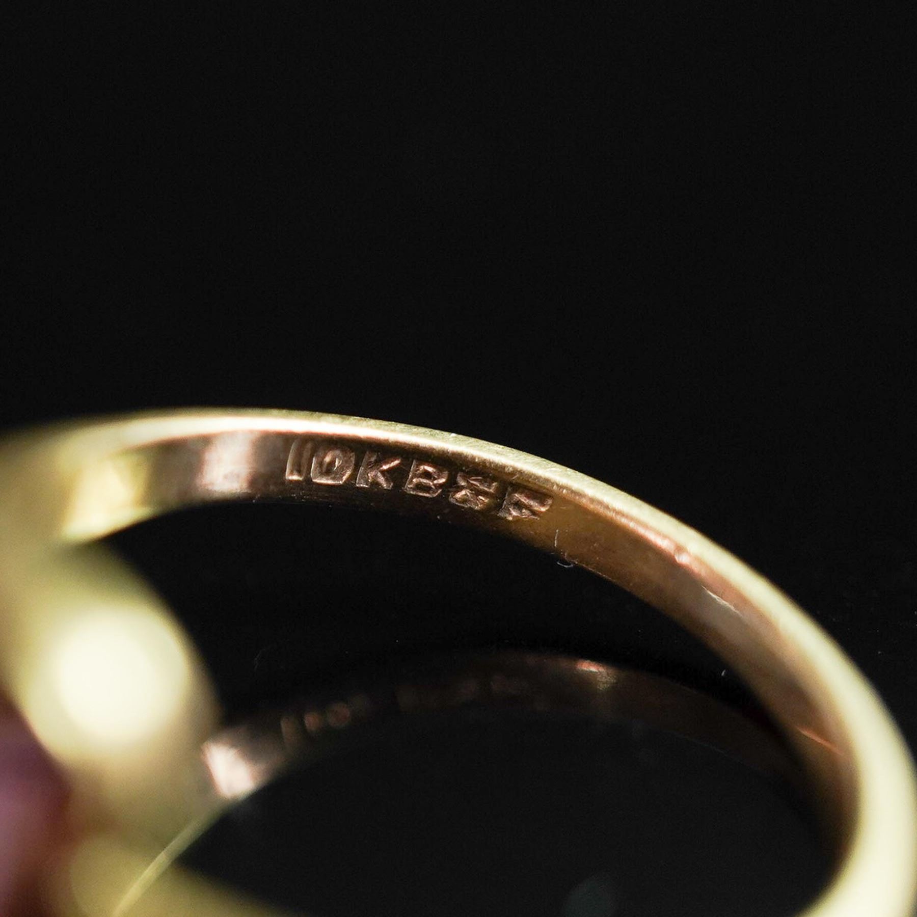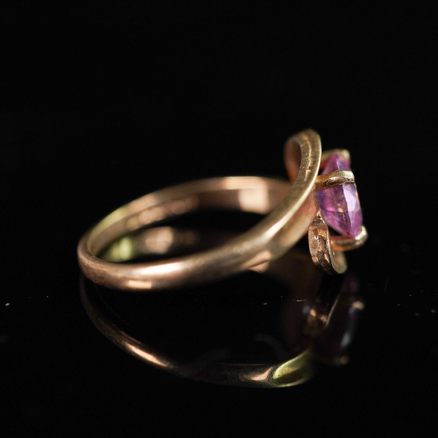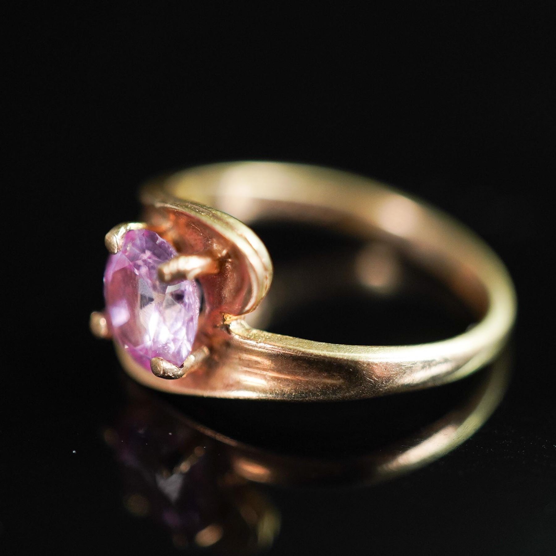A vintage 10K yellow gold ring featuring a vibrant round cut pink topaz set in a four-prong mount. The gemstone is beautifully framed by a sweeping bypass-style band, lending a graceful and refined silhouette. The inner band is stamped 10K B&F, identifying the maker as Baden & Foss Inc., a known American jewelry manufacturer. The gemstone was tested and confirmed as pink topaz using a Presidium Gem Tester II. A timeless design with bold color, suitable for both everyday elegance and special occasions.
