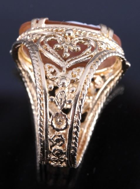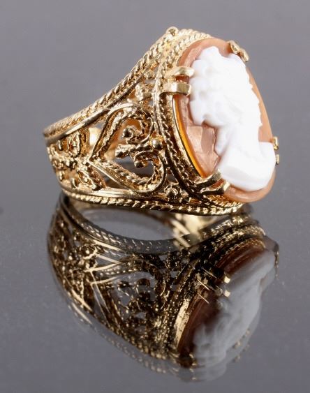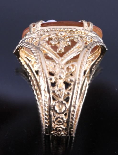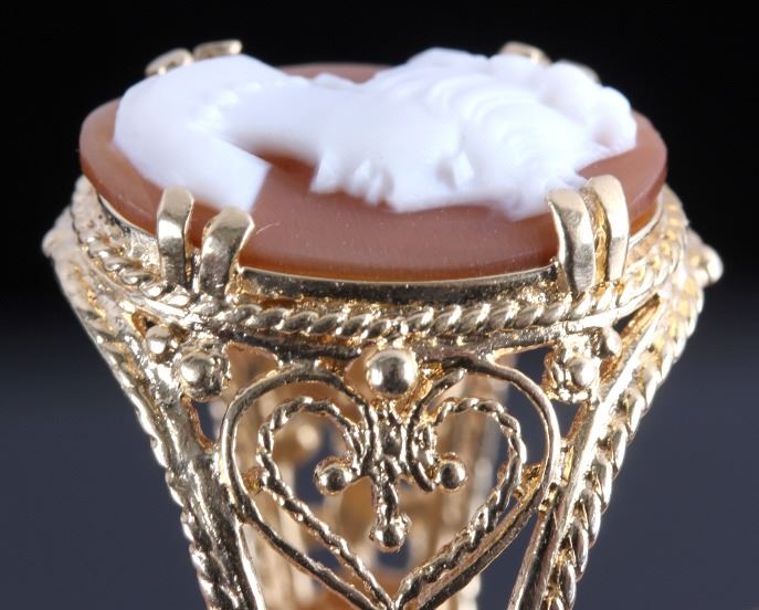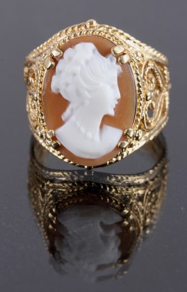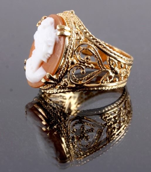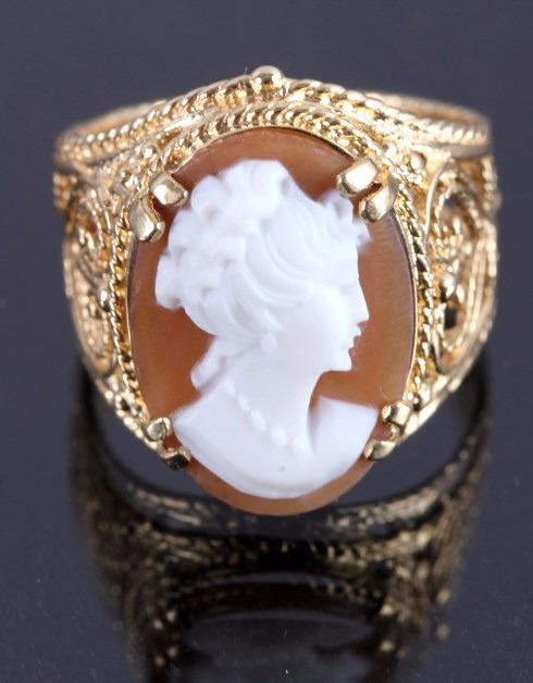 This lot features a 10K cameo carved shell and gold ring. The ring features intricate 10K gold scrollwork design with a carved shell cameo, which depicts a features a beautiful young woman's side profile with flowing hair. The ring is in good condition . The ring measures 8 1/2.
