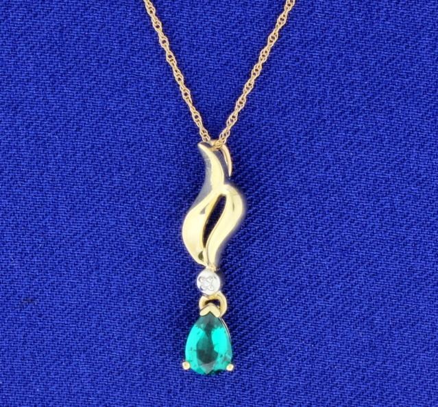 The pear emerald is a synthetic emerald. The chain is 18", 10K chain. The diamond is approx. 0.01 ct. The length of the pendant is 1". 1.8g