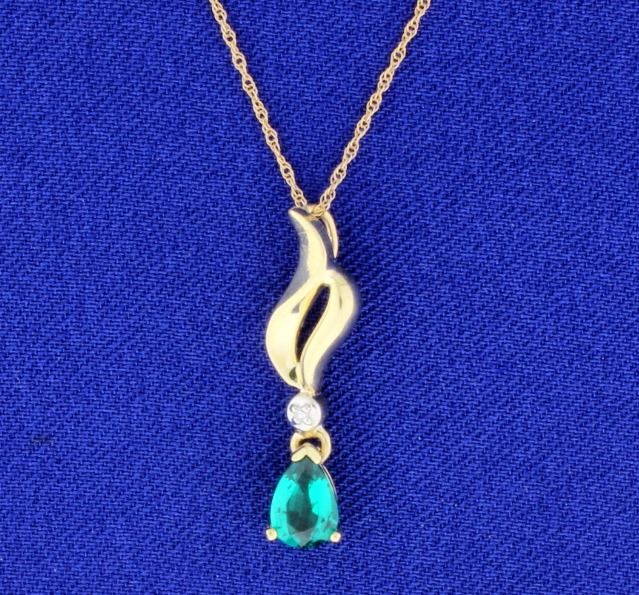 The pear emerald is a synthetic emerald. The chain is 18", 10K chain. The diamond is approx. 0.01 ct. The length of the pendant is 1". 1.8g