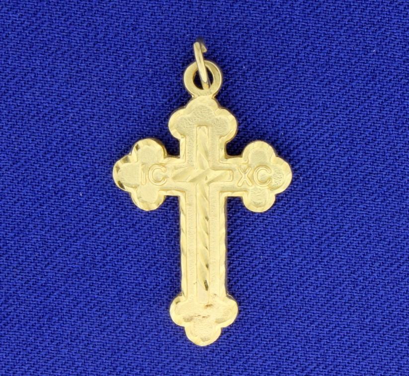 10K yellow gold, the cross is 1 1/4 inch long with great detail! 2.4g