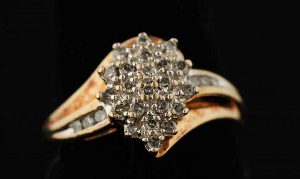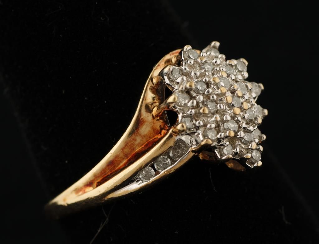 Flashy 10K diamond cluster ring. The 28 diamonds total almost 1/2 carat. They form a pear shape of all sparkling diamonds and extend down the shoulders. The diamonds are of average clarity and color. The ring is size 7 and weighs 2.3 grams. Retails for $800-1250.
