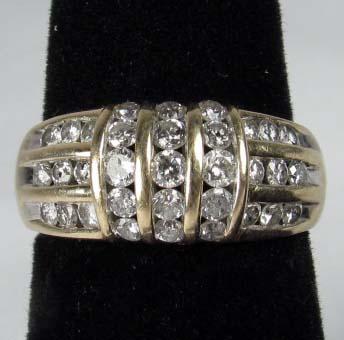 10K GOLD AND GEMSTONE LADIES RING - 5.6 GRAMS - SIZE 6 - It appears to have diamonds, were are not sure because we don't have a tester. Also the ring has a sizer in it.