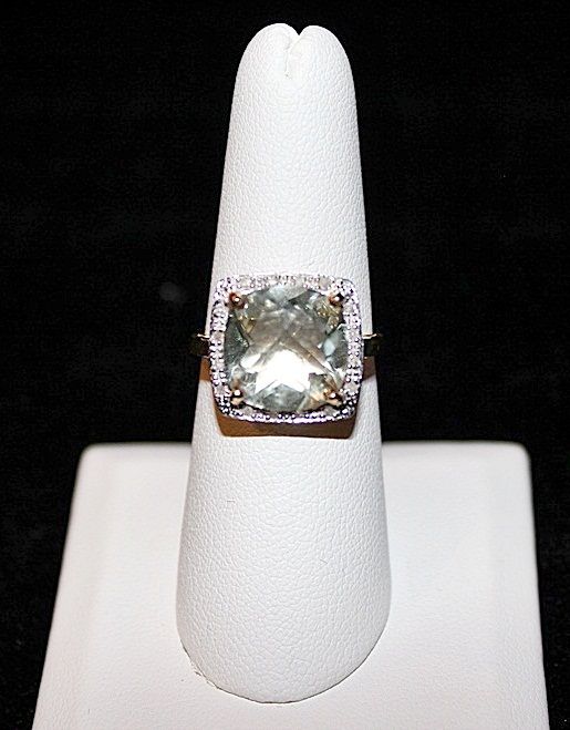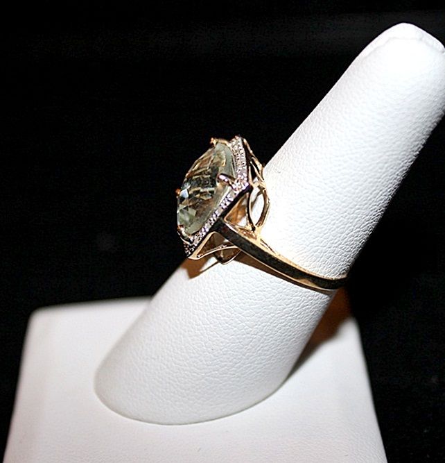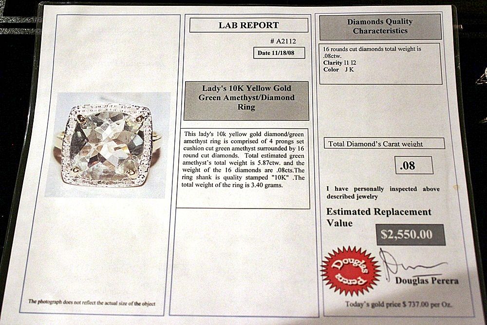 LADY'S 10K YELLOW GOLD RING WITH 1 CUSHION CUT GREEN AMETHYST AND 16 ROUND CUT DIAMONDS. DIAMONDS: 0.08CTW CLARITY: I-1/I-2 COLOR: J-K AMETHYST: 5.87CTW. EST. RETAIL (AT TIME OF APPRAISAL: 2008): $2550.00. COMES WITH LAB REPORT.