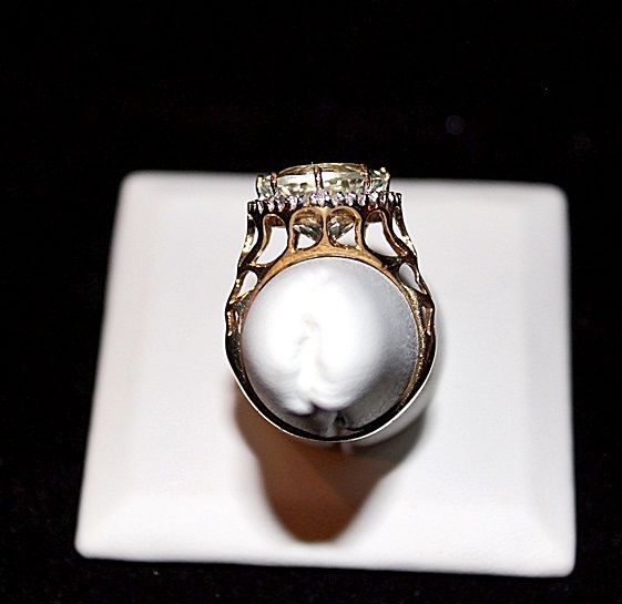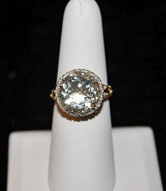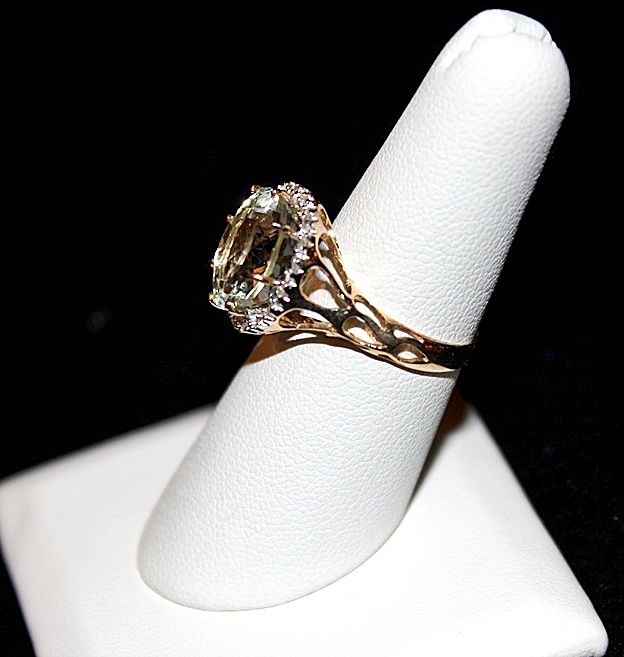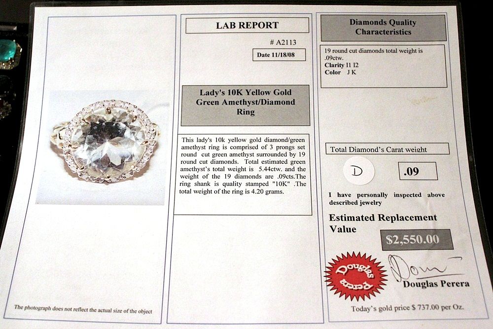 LADY'S 10K YELLOW GOLD RING WITH 1 ROUND CUT GREEN AMETHYST AND 19 ROUND CUT DIAMONDS. DIAMONDS: 0.09CTW CLARITY: I-1/I-2 COLOR: J-K AMETHYST: 5.44CTW. EST. RETAIL (AT TIME OF APPRAISAL: 2008): $2550.00. COMES WITH LAB REPORT.