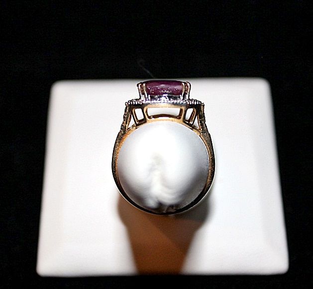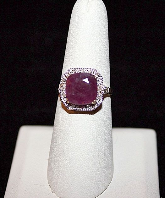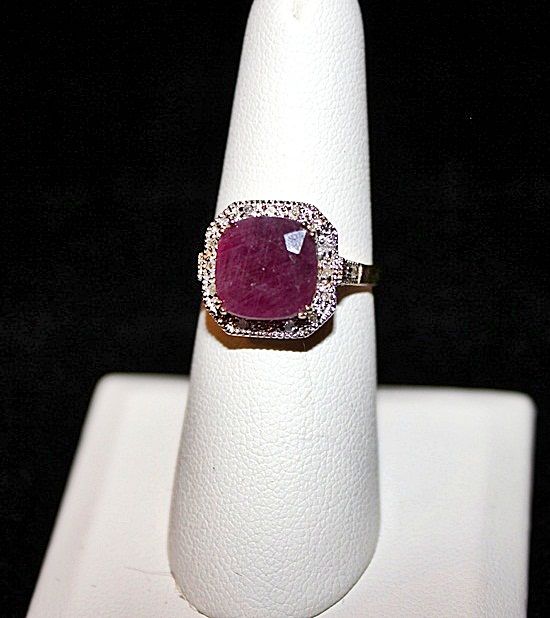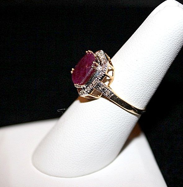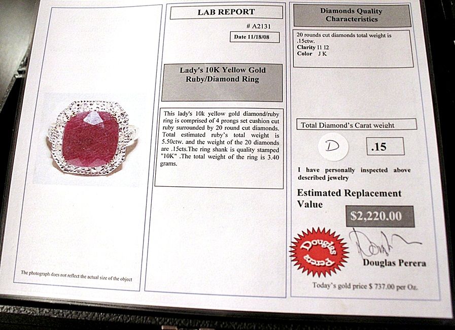 LADY'S 10K YELLOW GOLD RING WITH 1 CUSHION CUT RUBY AND 20 ROUND CUT DIAMONDS. DIAMONDS: 0.15CTW CLARITY: I-1/I-2 COLOR: J-K RUBY: 5.50CTW. COMES WITH LAB REPORT. ESTIMATED RETAIL VALUE (AT TIME OF APPRAISAL: 2008): $2220.00.