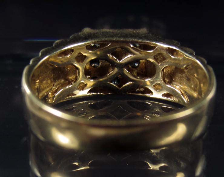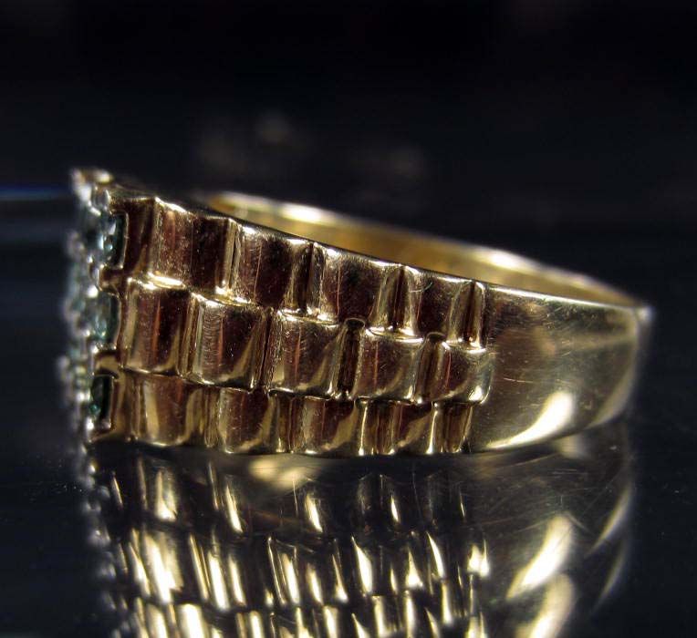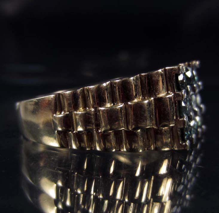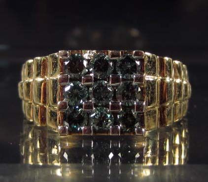 .82 cts of Blue Diamonds set in a 9 stone square design accented by a ribbed styled band. Total weight approx. 6.8 grams.