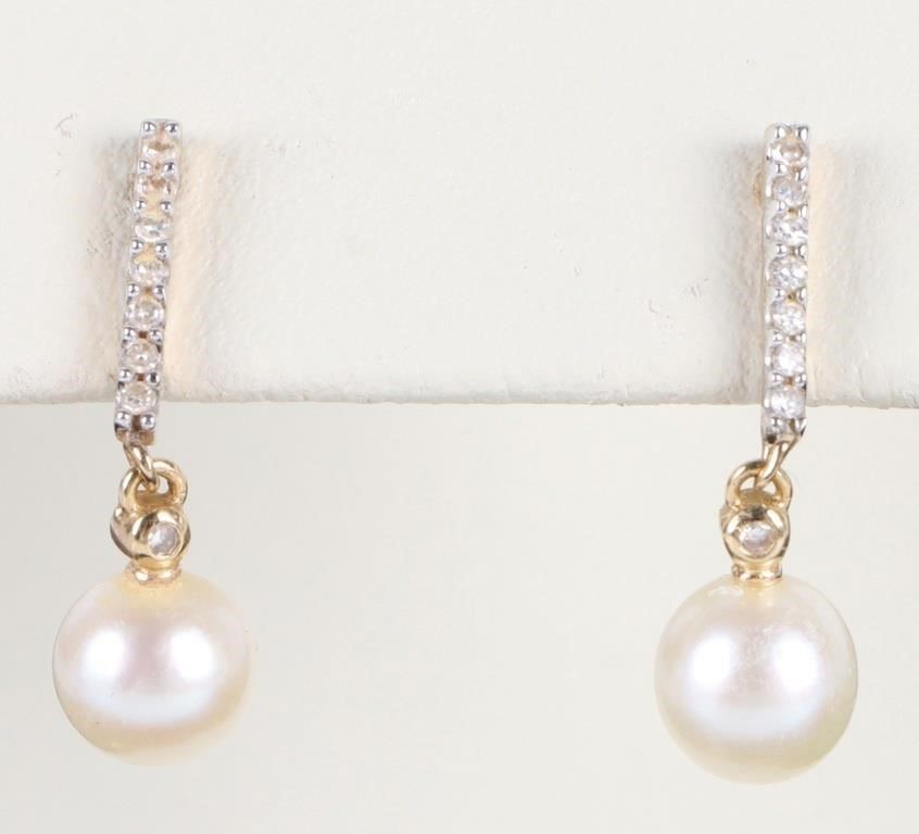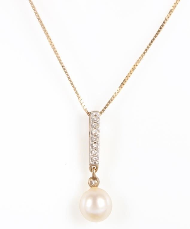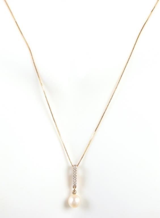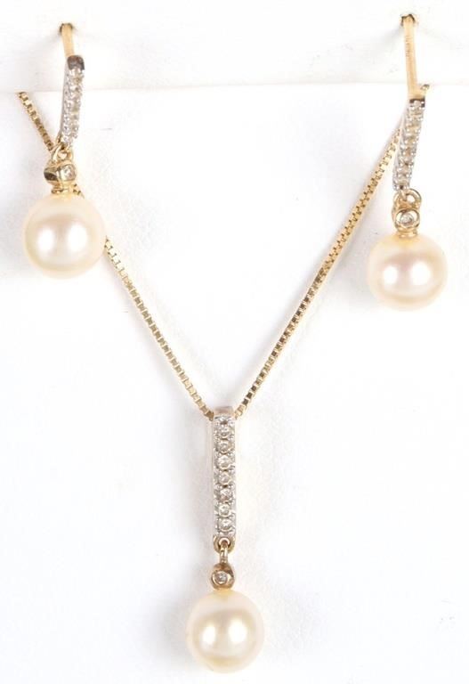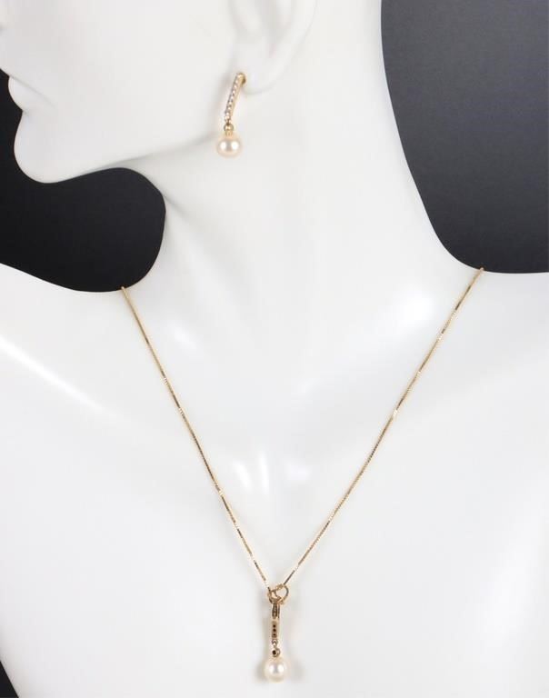 10K Yellow Gold Pearl & amp; Diamond necklace and earring matching set.