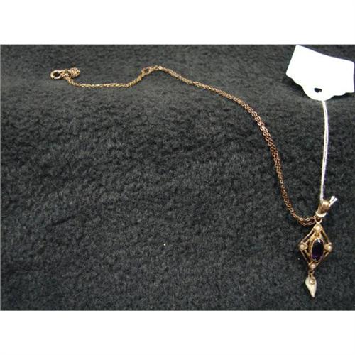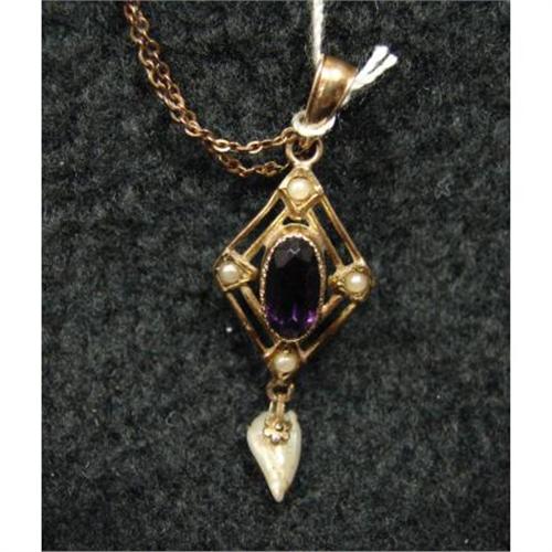 10K GOLD VICTORIAN AMETHYST PENDANT. Has oval amethyst at center with 4 seed pearls set in 10K gold with small river pearl drop. Pendant drop approx. 27mm. Unmarked chain measures 16”.