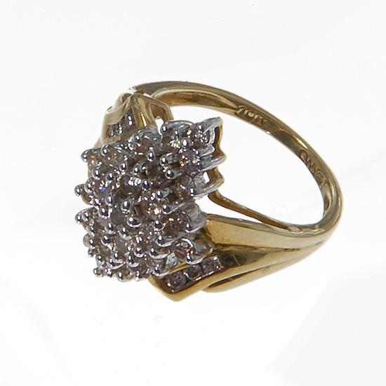 Beautiful 1 ct 31 Diamond 10k Gold ladies cluster ring. 5 gram setting weight. Retail tagged at $2895 when gold was at $350! per ounce; THIS RING IS A REAL VALUE!