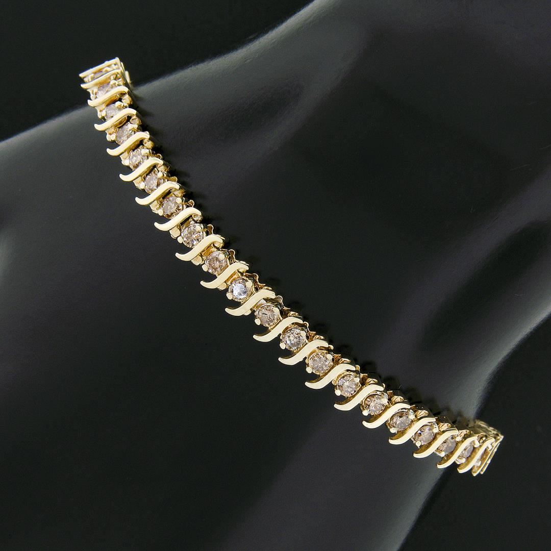 A solid 10k yellow gold line tennis bracelet, with 49 round brilliant cut natural champagne diamonds (I1/I2 ; 2ctw). It weighs a total of 8.28 grams, measures 5.1mm wide, and measures 6.75 inches in length.