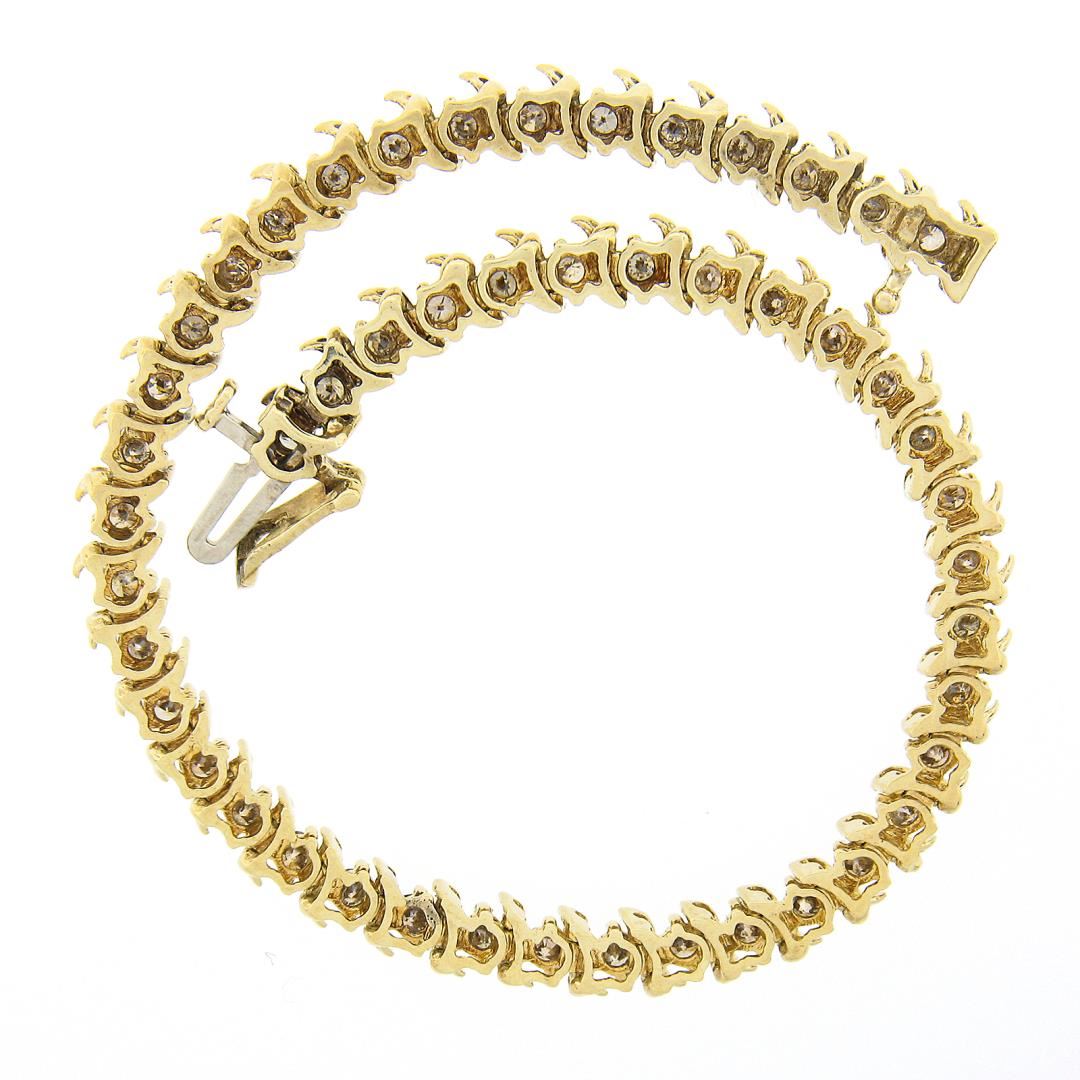A solid 10k yellow gold line tennis bracelet, with 49 round brilliant cut natural champagne diamonds (I1/I2 ; 2ctw). It weighs a total of 8.28 grams, measures 5.1mm wide, and measures 6.75 inches in length.