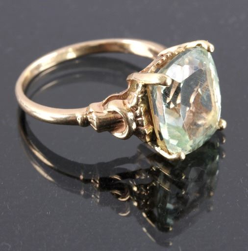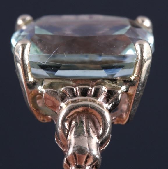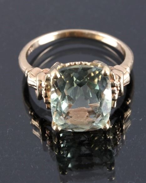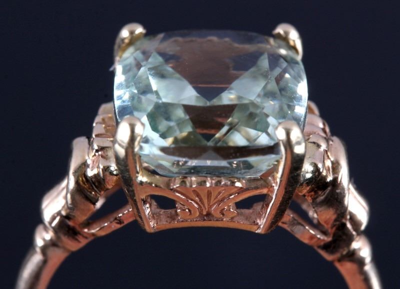 This is a 10K gold and aquamarine ring. The ring features a stunning cushion cut aquamarine stone set in gold. The ring is marked "10K" and is in good condition. The ring is size 6.5.