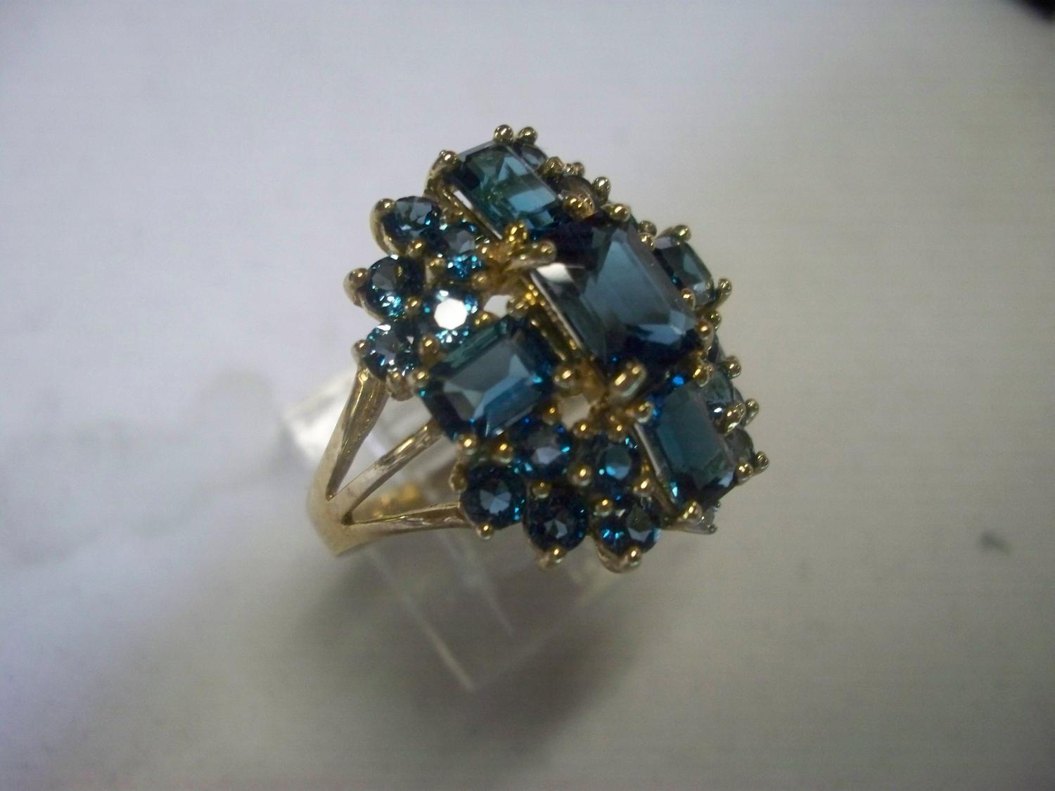 10K Gold Blue Topaz Stone Ring with large square and small circular stone pattern
