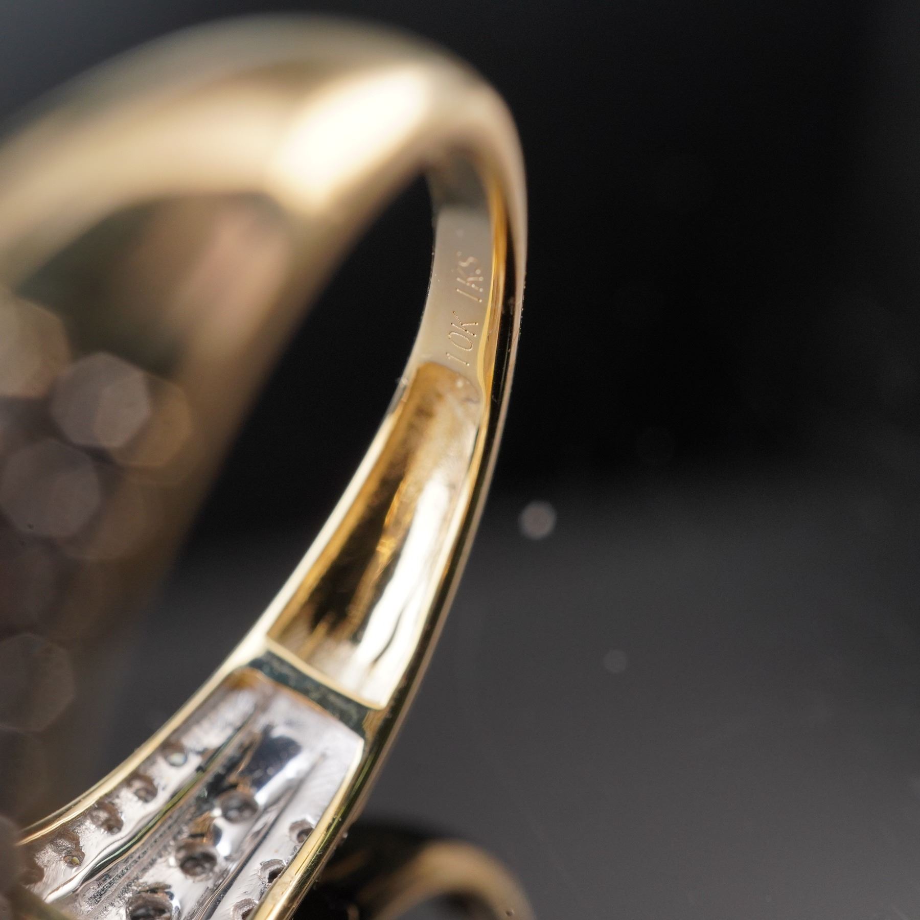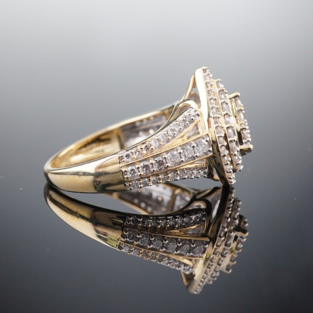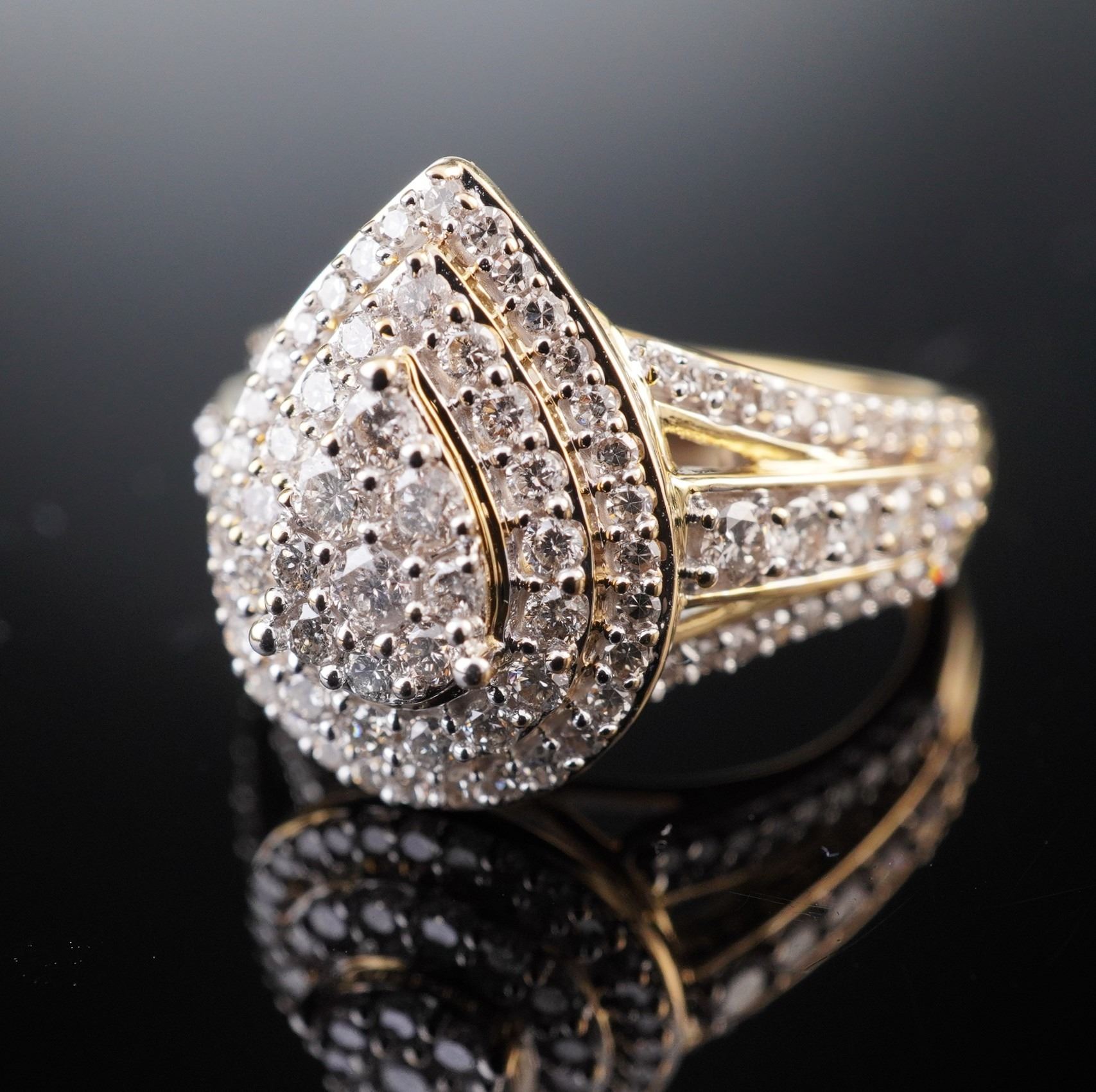 Yellow gold ring set with multiple round brilliant-cut diamonds arranged in a teardrop-shaped triple halo cluster. The diamonds extend along split shoulders, creating continuous pave coverage. The gallery features an open lattice undercarriage for light flow. Interior stamped 10K IKS. Weight: 4.6 g.
