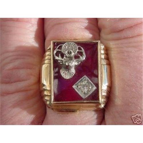 10K Gold Elks Fraternal Ring w/ 2 Diamonds on Cranberry Glass, Size 9 1/4, Metric Size 61, excellent condition. Shipping cost will be the USPS estimate + insurance to be sent in invoice after purchase is made.