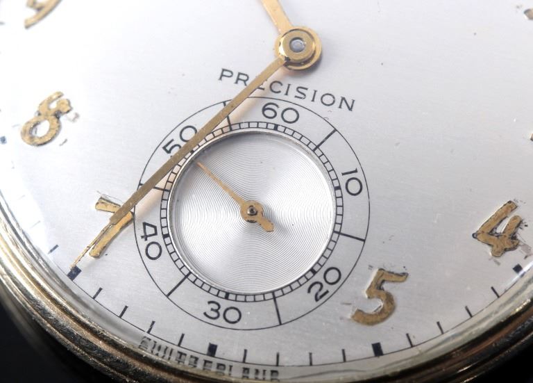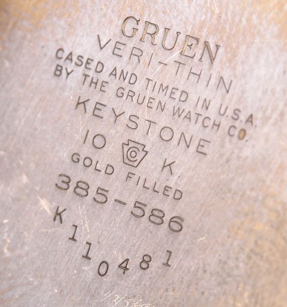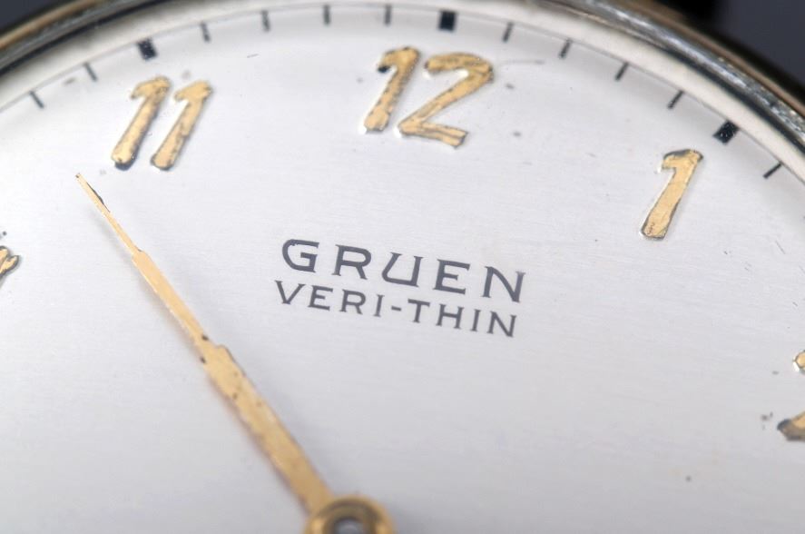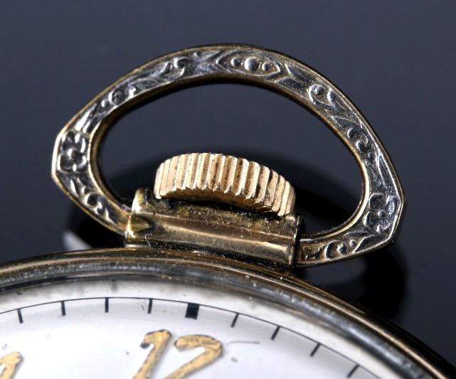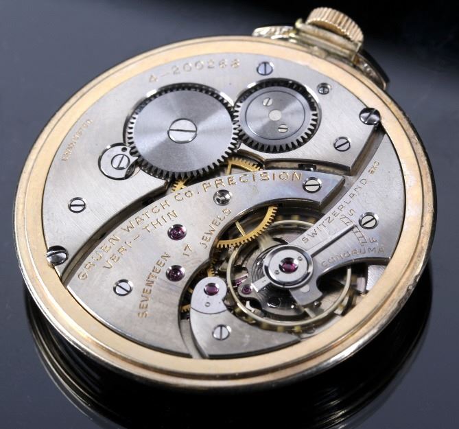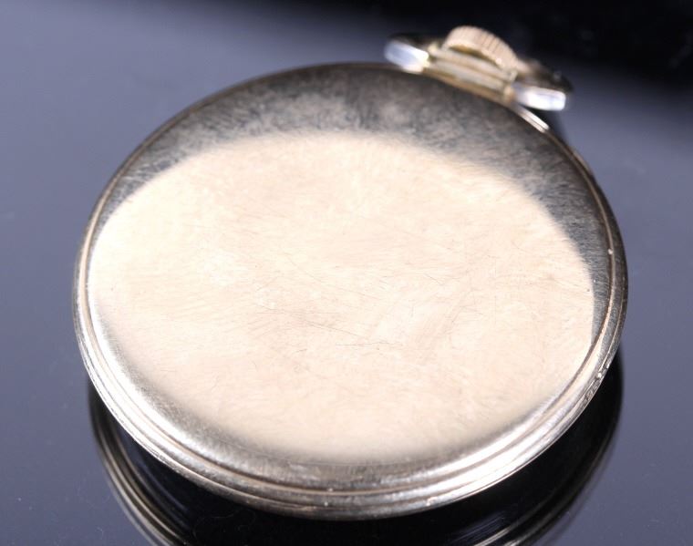 This 10K Gold Gruen Veri-Thin pocket watch gives off a handsome look that is hard to find today. This watch features a gold case and white front with gold lettering, the chain loop has very subtle engravings. This is a working watch. It shows good condition for its age, it doest show some wear on the case (see photos). It measures 1 5/8" D x 1/4" thick