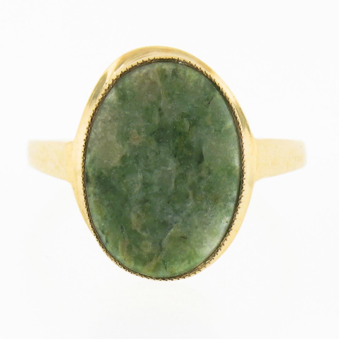 10K Gold Milgrain Bezel Set Oval Cabochon Jade Polished Simple Solitaire Ring