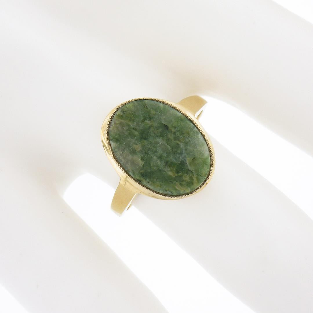 A solid 10k yellow gold solitaire ring, with 1 oval cabochon cut natural jade (14.0x10.1mm). The ring is size 6.0, weighs a total of 2.93 grams, and measures 15.40mm wide.