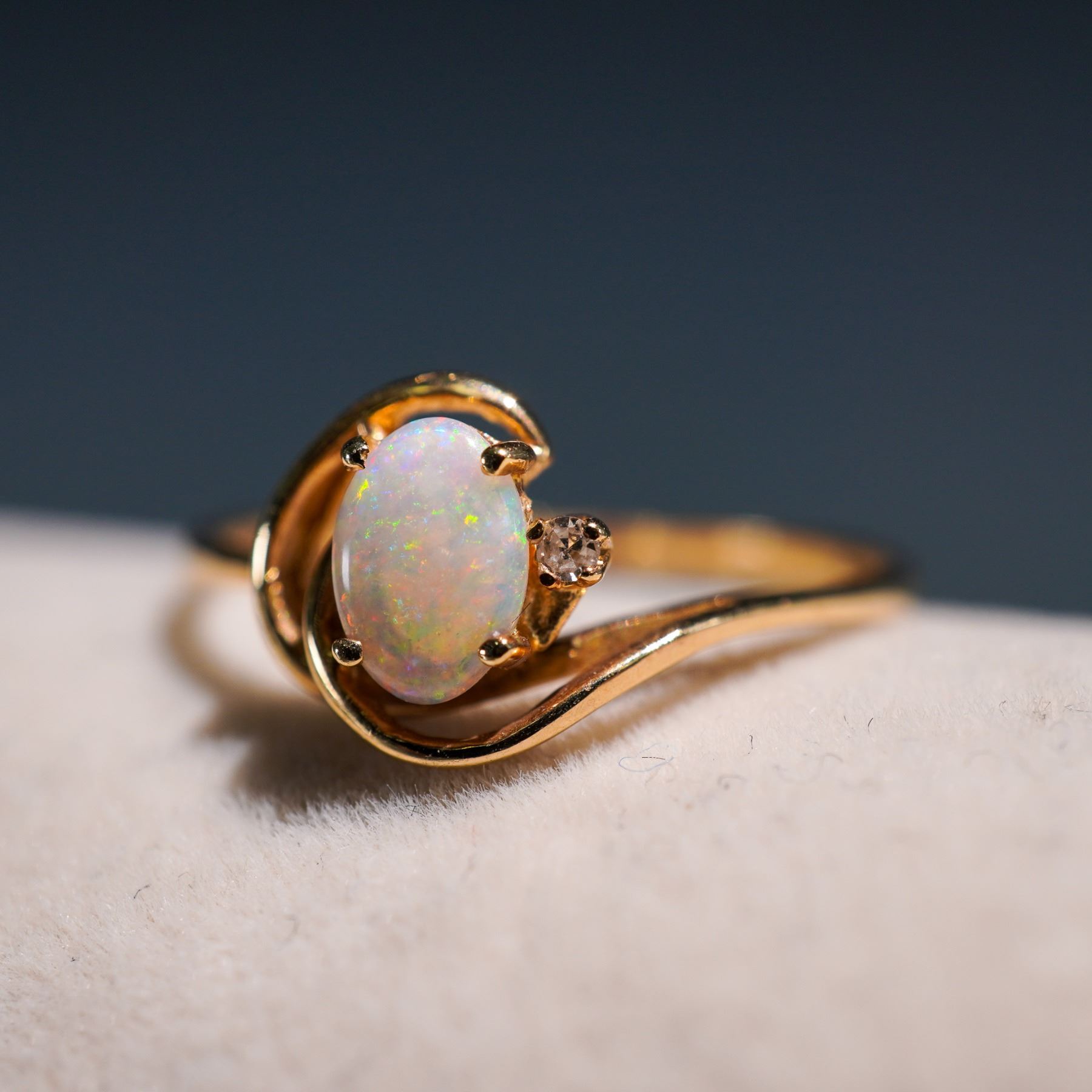 This delicate ring features an oval-cut opal set in 10K yellow gold, marked 10K HK along with partial Roman lettering. The opal displays vibrant flashes of green, pink, and blue under light, characteristic of natural opals, and is accented by a small round diamond to the side. The bypass-style design gently curves around the opal, giving the ring graceful movement and understated sparkle. A charming vintage piece with soft iridescence and classic appeal. Approx Total Weight: 1.22g includes stones.