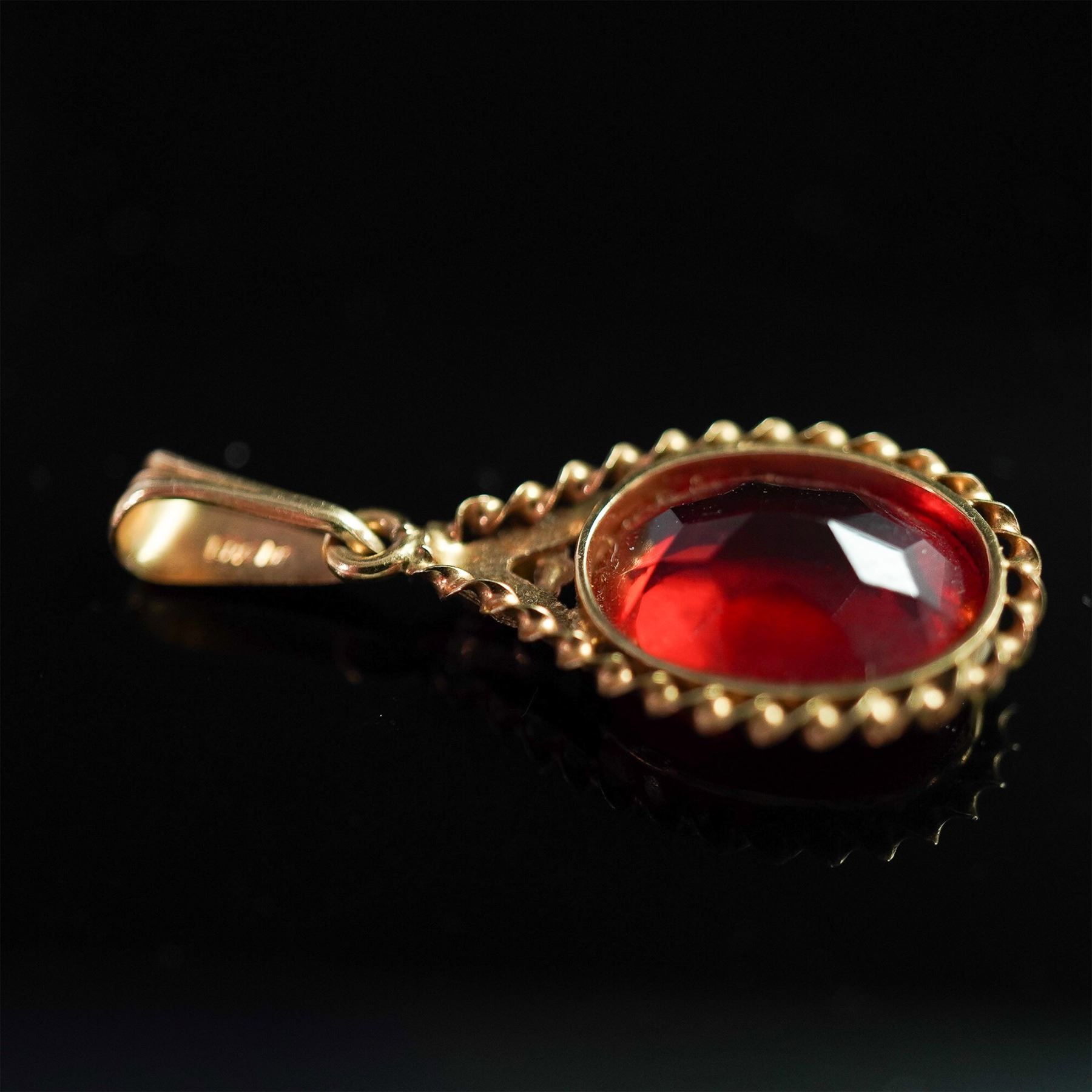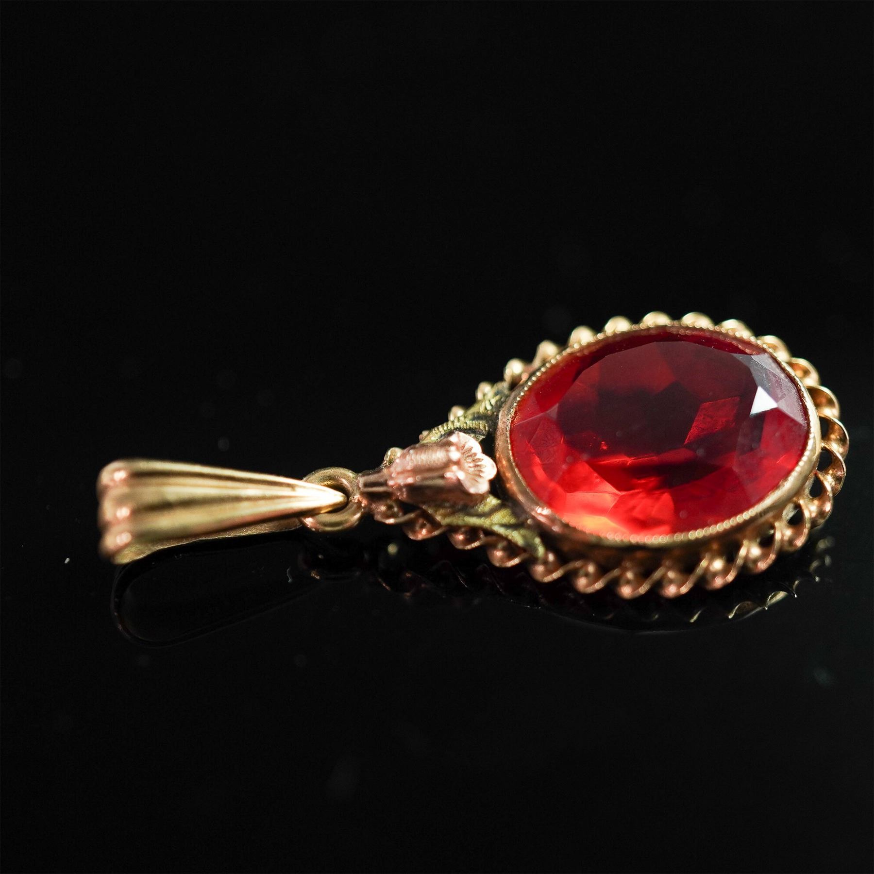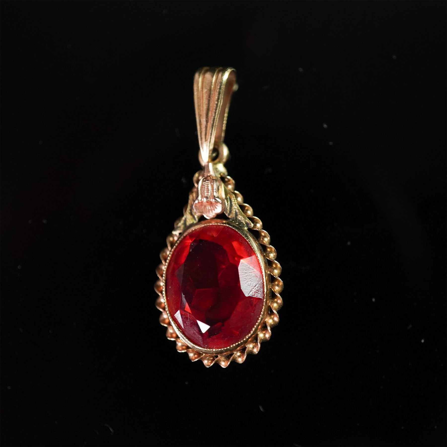 Delight in the timeless charm of this vintage 10K gold pendant featuring a striking red simulated gemstone. The teardrop-shaped stone is beautifully faceted, capturing light with a rich, fiery glow, while the twisted gold-tone border and delicate floral accent add a touch of elegance. Crafted in 10K gold, as marked on the bail, this piece offers a classic appeal perfect for everyday wear or special occasions. A lovely addition to any jewelry collection or a thoughtful gift for a vintage jewelry enthusiast.