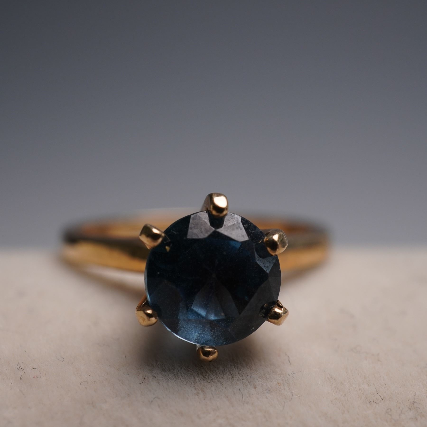 This elegant solitaire ring is crafted in 10K yellow gold and marked SABRINAS 10K inside the band. It features a round faceted blue topaz set in a classic six-prong setting that lifts the stone to catch the light beautifully. The topaz displays a cool, vivid blue hue with excellent clarity and brilliance. A timeless design perfect for daily wear, stacking, or as a December birthstone gift. Approx Total Weight: 2.29g includes stones.