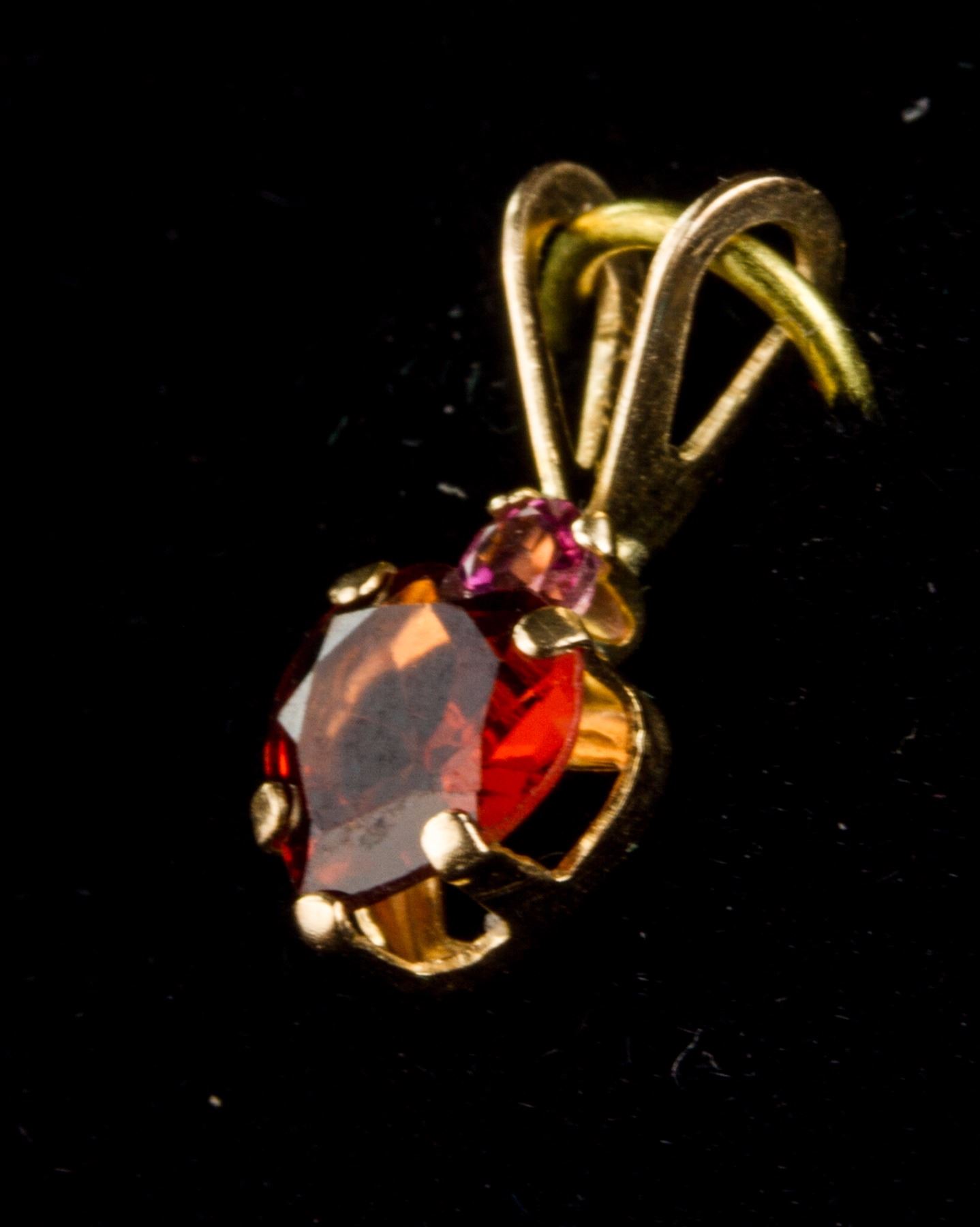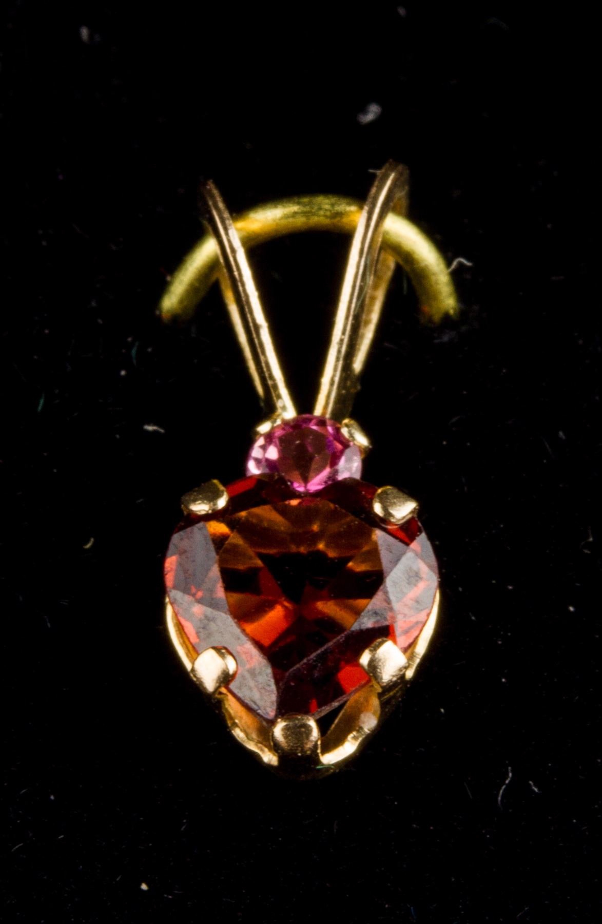 10k yellow gold tourmaline and garnet pendant; featuring a heart shaped pendant, replacement value CAD$100; 1.1 cm x 0.5 cm, 0.24 grams