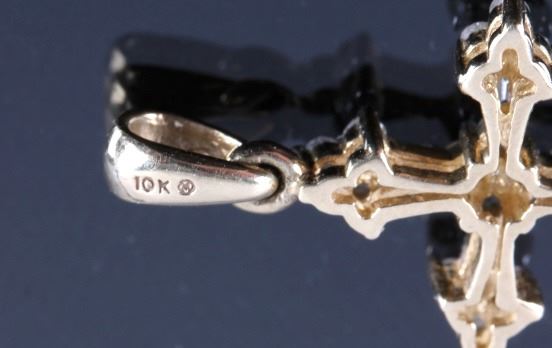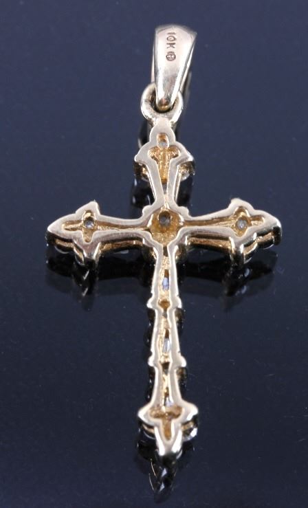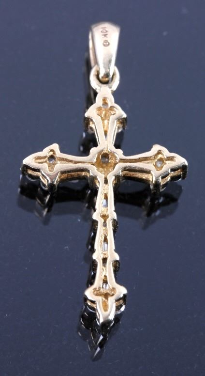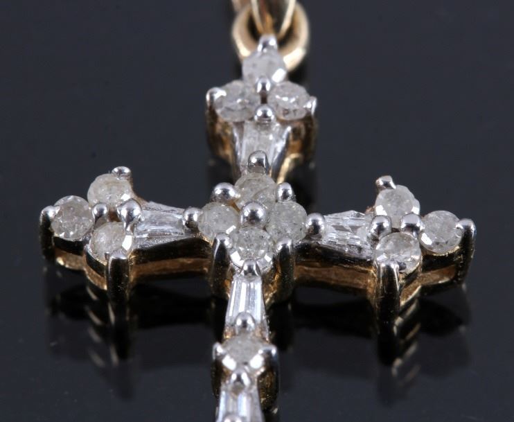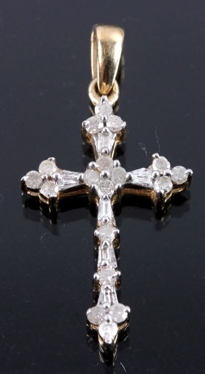 This is a 10K gold and diamond cross. The cross is marked "10K" and features 18 round cut and 6 baguette diamonds. The cross is in good condition. It measures .5" x 1".