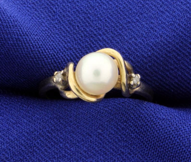 In 10K yellow gold there is one 6.5mm pearl with great luster and two 1 pt diamonds. Size 7 2.7g